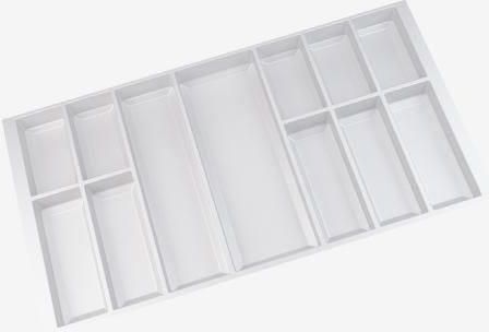Wkład CLASSICO 900 do szuflady Antaro o wymiarch 816 x 474/ biały wkład na sztućce Wkład Classico na sztućce i akcesoria kuchenne w kolorze białym. Wkład pasuje do szuflad o szerokości frontu 900 mm i głębokości prowadnicy 500 mm. Wkład ma po szerokości i po długości szerszy zapas, który umożliwia samodzielne docięcie wkładu do niestandardowych wymiarów szafki z szufladami. Wkład do szuflady wykonany jest z bardzo dobrego jakościowo, wytrzymałego tworzywa sztucznego, bezzapachowego, o grubości 2 mm. Solidny, odporny na odkształcenia i pęknięcia, jest bardzo lekki. Jest łatwy do czyszczenia, gładka powierzchnia wkładu nie „przyjmuje brudu”, nie widać na niej smug czy zarysowań. Jest bardzo estetycznie wykonany i bardzo ładnie wygląda w każdej szufladzie nie tylko w nowoczesnych meblach ale również w szufladach bardziej tradycyjnych. Praktyczny wkład do szuflady pozwoli na utrzymanie porządku i szybkie odłożenie umytych sztućców na właściwe miejsce. Przy podanej szerokości do dyspozycji mamy 12 komór. Mniejsze komory posłużą do przechowywania łyżeczek, widelczyków czy innych drobnych akcesoriów np.: zaparzacza do herbaty, większe komory świetnie zorganizują przestrzeń na łyżki stołowe, noże i widelce, natomiast największa szeroka komora idealna będzie do dużych łyżek do mieszania potraw, szczypców, łopatek czy chochli. Wymiary wkładu: szerokość: 816 mm, długość: 474 mm, wysokość: 53 mm. Wymiary komór (komory posiadają kształt zbliżony do trapezu): 1x komora największa 430x160 mm (wymiar u góry komory), 400x130 mm (wymiar na dnie komory), 1x komora duża 430x85 mm (wymiar u góry komory), 400x60 mm (wymiar na dnie komory), 5x komory średnie 250x93 mm (wymiar u góry komory), 220x63 mm (wymiar na dnie komory), 5x komory małe 170x93 mm (wymiar u góry komory), 140x43 mm (wymiar na dnie komory). Uwaga: nie świadczymy usług w zakresie docinania wkładu. W razie potrzeby wkład można przycinać samodzielnie nożykiem tapicerskim lub na maszynie solarskiej. Sposób docięcia wkładu: wkład układamy płaską stroną na równiej i twardej powierzchni, w odpowiednim miejscu przykładamy długą linijkę i przy pomocy ostrego nożyka przerysujemy kilka razy w tym samym miejscu, następnie załamujemy odciętą krawędź. Do wkładu polecamy profile wykończeniowe, które idealnie zakryją ewentualne nierówności powstałe podczas docinania wkładu oraz wypełnią szczeliny między bokiem szuflady a wkładem (profile do dokupienia, nie wchodzą w komplet z wkładem). Parametry techniczne Wykończenie Kolor biały Wymiary Wysokość 53 mm Szerokość 816 mm Głębokość 474 mm