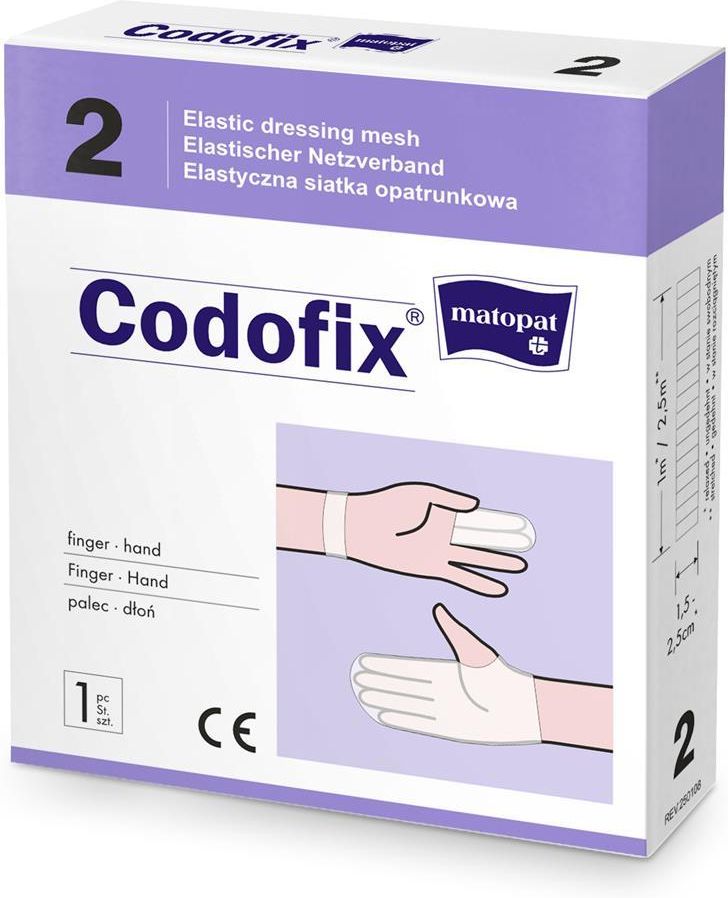 Elastyczna siatka opatrunkowa Codofix Siatka opatrunkowa Codofix stanowi doskonałą alternatywę dla tradycyjnych bandaży, umożliwiając stabilizację opatrunków na różnych częściach ciała, zwłaszcza na tych trudno dostępnych, jak głowa, klatka piersiowa czy krocze. Siatka Codofix wykonana jest z elastycznej przędzy poliuretanowo-poliamidowej, przyjaznej dla skóry. Jej zakładanie jest proste i szybkie, a materiał doskonale przylega do ciała, nie krępując ruchów. Zastosowanie produktu - przy zakładaniu opatrunków na trudno dostępne i niewygodne miejsca na ciele, - przy ranach operacyjnych brzucha, klatki piersiowej i opatrunkach głowy, - do podtrzymywania opatrunków na ranach poparzeniowych, - w chirurgii dziecięcej. Cechy produktu - jałowość: niejałowy, - rodzaj: jednorazowy, - materiał: przędza szczepiona z przędzy poliamidowej (50%) i poliuretanowej (50%). Siatki opatrunkowe Codofix uzyskały pozytywną opinię z badań dermatologicznych, które wykazały, że nie wykazują one własności drażniących lub uczulających. Uwagi i środki ostrożności Wyrób jednorazowego użytku, niesterylny, nie używać jeżeli opakowanie jest uszkodzone. nie należy stosować wyrobu pod opatrunki gipsowe, nie stosować do użytku wewnętrznego, nie stosować u osób z nadwrażliwością na składniki wyrobu: poliamid i poliuretan. Dostępne warianty produktu Codofix 1 Parametry produktu - zastosowanie: palec - szerokość: maksymalnie 1,5 cm - długość w stanie użytkowym (rozciągniętym): 1 lub 10 m Codofix 2 Parametry produktu - zastosowanie: palec, dłoń - szerokość: 1,5-2,5 cm - długość w stanie użytkowym (rozciągniętym): 1 m lub 10 m Codofix 3 Parametry produktu - zastosowanie: dłoń, stopa - szerokość: 2,5-3,5 cm - długość w stanie użytkowym (rozciągniętym): 1 m lub 10 m Codofix 4 Parametry produktu - zastosowanie: podudzie, kolano, ramię, stopa, łokieć - szerokość: 3,5-4,5 cm - długość w stanie użytkowym (rozciągniętym): 1 m lub 10 m Codofix 6 Parametry produktu - zastosowanie: głowa, ramię, podudzie, kolano - szerokość: 5-6,5 cm - długość w stanie użytkowym (rozciągniętym): 1 m lub 10 m Codofix 8 Parametry produktu - zastosowanie: udo, głowa, biodra - szerokość: 7-9,5 cm - długość w stanie użytkowym (rozciągniętym): 1 m lub 10 m Codofix 10 Parametry produktu - zastosowanie: biodra, brzuch - szerokość: 10-13,5 cm - długość w stanie użytkowym (rozciągniętym): 1 m lub 10 m Codofix 14 Parametry produktu - zastosowanie: klatka piersiowa, biodra, brzuch - szerokość: minimum 14 cm - długość w stanie użytkowym (rozciągniętym): 1 m lub 10 m