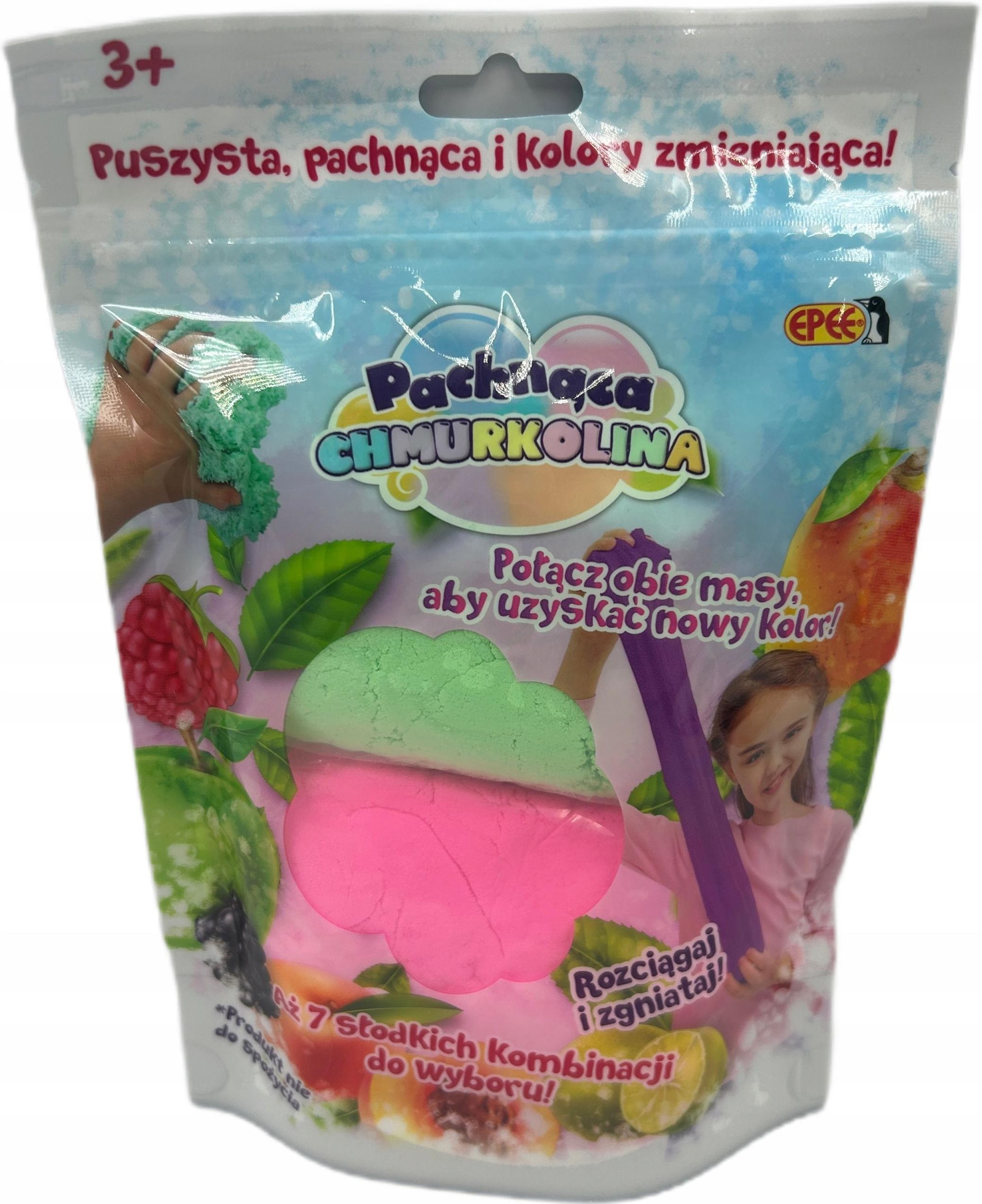 PACHNĄCA CHMURKOLINA SLIME ZMIENIA KOLOR 2x30g ŻÓŁTO - NIEBIESKA ZIELONE JABŁKO EPE_09548_6 Pachnąca Chmurkolina seria 4 zmieniająca kolor – 1-pack - 2x30g Chmurkolina to miękka, delikatna i puszysta masa plastyczna, którą możesz ugniatać, formować i rozciągać. Wybieraj spośród szerokiego asortymentu kolorów i zapachów i oddaj się wspaniałej, kreatywnej zabawie! Teraz Chmurkolina zmieniająca kolor z ciemniejszego na jaśniejszy pod wpływem ciepła, w 7 słodkich kolorach i zapachach do wyboru: różowo/niebieska JEŻYNA zielono/niebieska MIĘTA żółto/niebieska ZIELONE JABŁKO różowo/żółta MANGO różowo/pomarańczowa BRZOSKWINIA różowo/zielona MALINA żółto/zielona LIMONKA Wysoko na niebie jest piękna kraina, to stamtąd się bierze nowa CHMURKOLINA! Formuj ją i rozciągaj - jest miękka, pachnąca i puchata jak wata cukrowa! Jak ją rozpoznać? Jest lekka jak piórko, wygląda zupełnie jak mięciutka chmurka: puszysta, plastyka i miła w dotyku! Pomysłów na zabawę znajdziesz z nią bezliku!