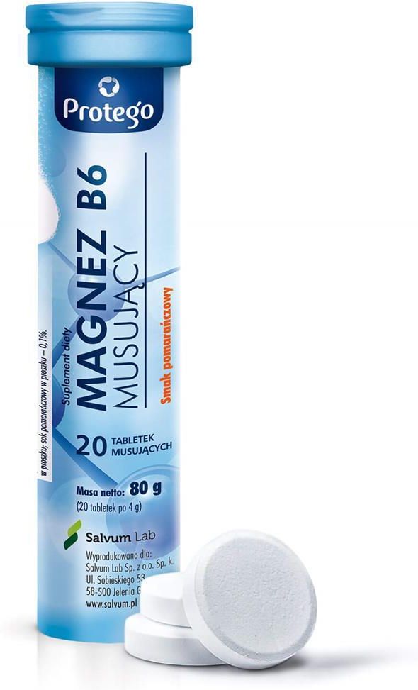 suplement diety  O SMAKU POMARAŃCZOWYM Protego Magnez B6 Musujący to suplement diety w postaci tabletek musujących zawierający magnez oraz witaminę B6. Zaleca się stosować: W stanach zmęczenia fizycznego i psychicznego W przypadku mało zróżnicowanej diety i spożywania dużej ilości kawy i alkoholu W przypadku zwiększonego zapotrzebowania na magnez i witaminę B6 Magnez pomaga w utrzymaniu równowagi elektrolitowej oraz zdrowych kości i zębów, a także w prawidłowym funkcjonowaniu mięśni oraz układu nerwowego. Przyczynia się do zmniejszenia uczucia zmęczenia i znużenia. Witamina B6 wspiera utrzymanie właściwego metabolizmu energetycznego, pomaga zmniejszać uczucie zmęczenia i znużenia. Uczestniczy w prawidłowym działaniu układu nerwowego i utrzymaniu funkcji psychologicznych. Opakowanie zawiera 20 tabletek musujących. Zawartość w porcji zalecanej do spożycia w ciągu dnia: *RWS – Referencyjna wartość spożycia Opakowanie zawiera 20 tabletek musujących Składniki: regulatory kwasowości: kwas cytrynowy, węglany sodu; substancja wypełniająca: sorbitole; węglan magnezu (magnez); aromaty; substancje przeciwzbrylające: glikol polietylenowy, poliwinylopirolidon; substancje słodzące: cyklaminiany, sacharyny; chlorowodorek pirydoksyny (witamina B6); barwnik: karoteny; koncentrat soku buraka czerwonego w proszku; sok pomarańczowy w proszku. Zaleca się stosować: W stanach zmęczenia fizycznego i psychicznego W przypadku mało zróżnicowanej diety i spożywania dużej ilości kawy i alkoholu W przypadku zwiększonego zapotrzebowania na magnez i witaminę B6 Magnez pomaga w utrzymaniu równowagi elektrolitowej oraz zdrowych kości i zębów, a także w prawidłowym funkcjonowaniu mięśni oraz układu nerwowego. Przyczynia się do zmniejszenia uczucia zmęczenia i znużenia. Witamina B6 wspiera utrzymanie właściwego metabolizmu energetycznego, pomaga zmniejszać uczucie zmęczenia i znużenia. Uczestniczy w prawidłowym działaniu układu nerwowego i utrzymaniu funkcji psychologicznych. Zalecane dzienne spożycie: 1 - 2 tabletki. Tabletkę należy rozpuścić w 200 ml chłodnej wody. Nie należy przekraczać zalecanej porcji do spożycia w ciągu dnia. Suplement diety nie może być stosowany jako substytut zróżnicowanej diety. Dla zachowania dobrego stanu zdrowia zalecany jest zrównoważony sposób żywienia i zdrowy tryb życia. Nie należy stosować w przypadku nadwrażliwości na którykolwiek ze składników preparatu. Kobiety w okresie ciąży i karmienia piersią stosowanie produktu powinny skonsultować z lekarzem. Opakowanie produktu Protego Magnez B6 Musujący zawiera 20 tabletek musujących w opakowaniu w formie tuby Spożycie w nadmiernych ilościach może mieć efekt przeczyszczający Warunki przechowywania: Przechowywać w temperaturze do 25 stopni C, w suchym miejscu, w zamkniętym opakowaniu. Przechowywać w sposób niedostępny dla małych dzieci. Wyprodukowano w Polsce dla: Salvum Lab Sp. z o.o. Sp. K. .ul. Sobieskiego 53, 58-500 Jelenia Góra www.salvum.pl