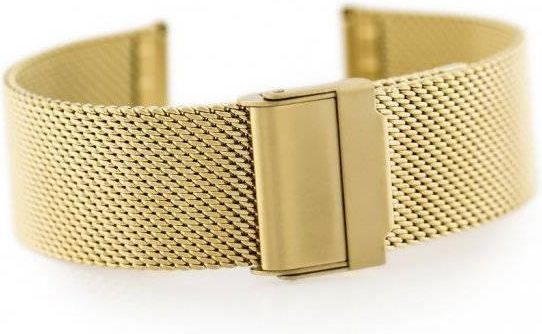 Stalowa złota błyszcząca prosta bransoleta siatkowa mesh do zegarka. Szerokość 24 mm. Zapięcie z dodatkowym zabezpieczeniem. Bransoleta pasuje do każdego zegarka ze standardowym mocowaniem o szerokości 24 mm. Komplet teleskopów gratis