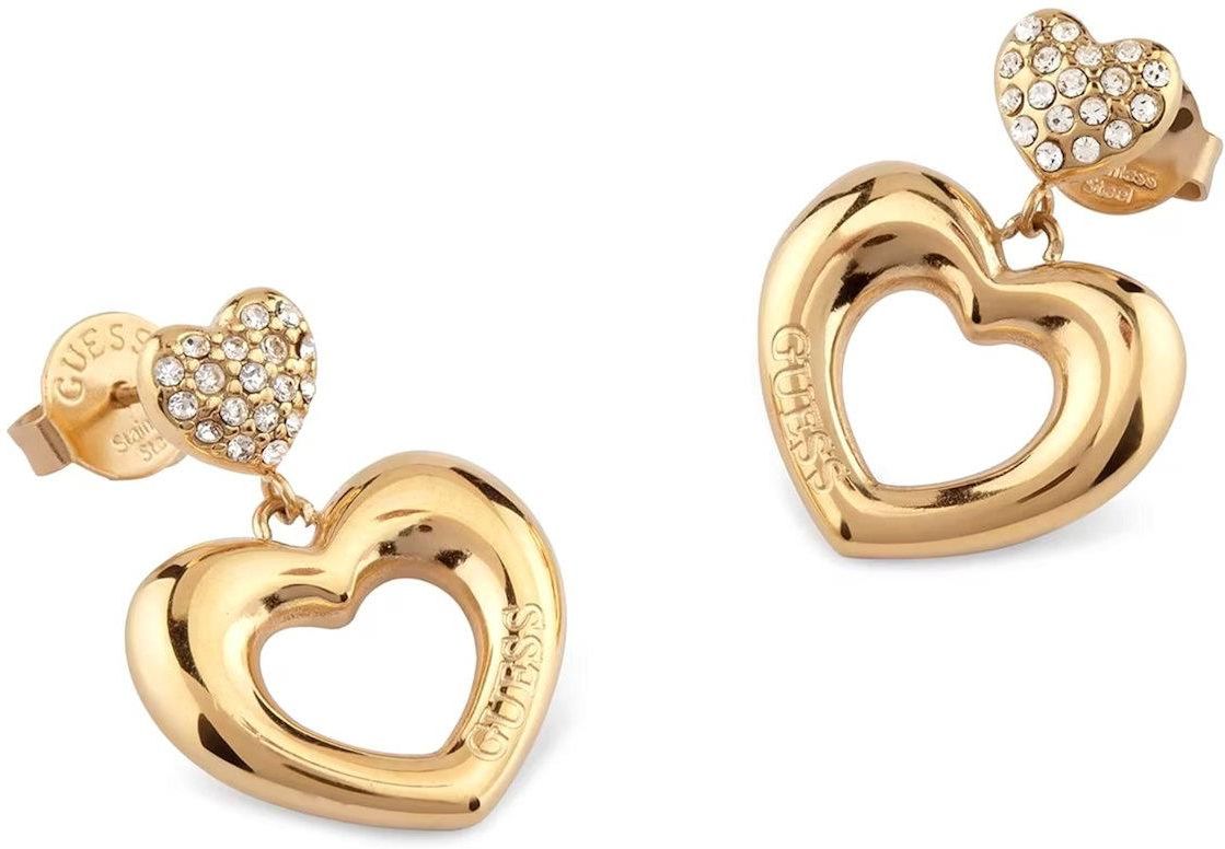 Damskie eleganckie platerowane pozłacane wysadzane kryształkami stalowe kolczyki Guess w kształcie serc. Kolekcja Crazy In Love. Złocenie w kolorze żółtego złota. Zapięcie na sztyft