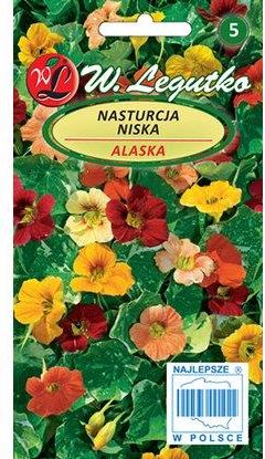 Nasiona nasturcji Alaska marki Legutko. Nasturcja Alaska to roślina jednoroczna wys.30-40 cm, silnie krzewiąca się o kulistym pokroju.O wartości tej formy stanowi kontrast jaki tworzą marmurkowato przebarwione, pstre, biało-zielone liście i różnobarwne kielichowate kwiaty ukazujące się od lipca do przymrozków.