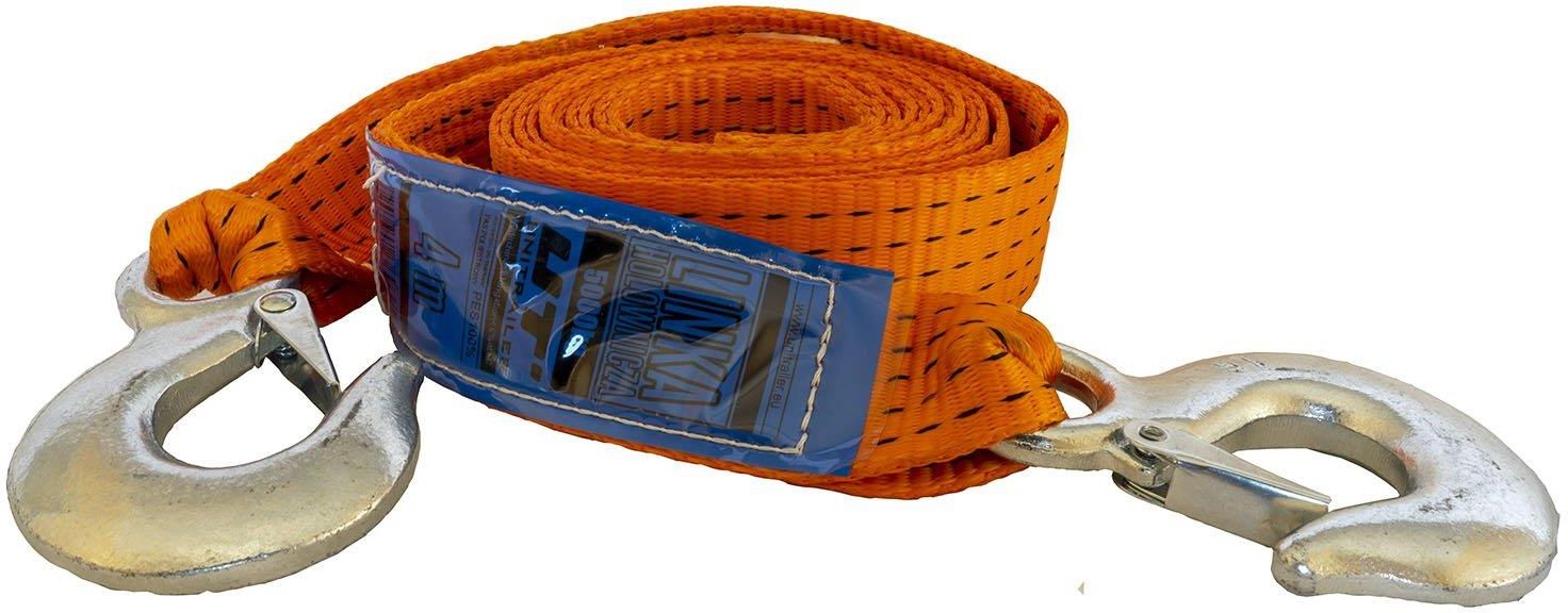 Linka holownicza z hakami 4,5 metra / 5 ton taśmowa Oryginalny produkt marki: HILLS SPÓŁKA Z OGRANICZONĄ ODPOWIEDZIALN Wytrzymała linka holownicza z hakami o długości 4,5 metra i wytrzymałości 5000 kg. Mocna linka holownicza wykonana z wysokiej jakości tkaniny poliestrowej. Jej obciążenie robocze wynosi 5000 kg. Długość linki wynosi 4,5 metra, a szerokość 50 mm. Na obu końcach zakończona jest hakami z blokadą. Produkt wyprodukowany w Polsce.