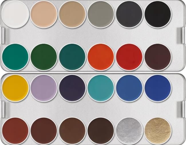 KRYOLAN - AQUACOLOR Make up Palette - Paleta 24 farb wodnych do malowania twarzy - ART. 1108 AQUACOLOR Make up Palette marki Kryolan. Paleta farb do twarzy i ciała. Zawiera 24 długotrwałych farbek, powstałych na bazie gliceryny, wysokiej jakości kremowych składników oraz bardzo intensywnych barwników. Z łatwością aplikują się na ciało oraz nie wymagają specjalnego wysiłku wkładanego w ich nakładanie. Można do tego użyć wilgotnej gąbeczki lub pędzla. Po wyschnięciu należy je delikatnie wypolerować przy pomocy dłoni lub miękkiej szmatki. Trzeba pamiętać, że nie należy pokrywać farb pudrem. Zaleca się użycie sprayu utrwalającego, szczególnie wtedy, gdy makijaż będzie wystawiony na trudne warunki atmosferyczne. Farbki bardzo łatwo usunąć ciepłą wodą z mydłem. Posiadają atest UE oraz Polski. Paleta farb do ciała i twarzy. Zawiera 24 różnych odcieni. Posiada kremową i długotrwałą formułę. Umieszczone w metalowej palecie z miejscem do mieszania farb. Średnica pojedynczej farbki: 32 mm. POSZCZEGÓLNE ODCIENIE:- K: biały 070, cielisty 406, beżowy 521, szary 074, grafitowo-szary 517, czarny 071, miętowa zieleń GR.21, trawiasta zieleń 512, szmaragdowy 096, neonowy pomarańcz MANDARIN, czerwony 079, śliwkowo-brązowy LAKE/ALTROT, żółty 509, jasny fiołkowy 482, śliwkowy 099, miętowy TK.2, błękitny 091, granatowy 510, orzechowy brąz 075, chłodny brąz 046, ciepły brąz 043, ciemny brąz 101, srebrny SILVER, złoty GOLD. Atrybuty Wymiary zamkniętej palety - 22,9 cm x 9,3 cm x 3 cm Pojemność (ml) - 80 ml PAO termin trwałości - 30M