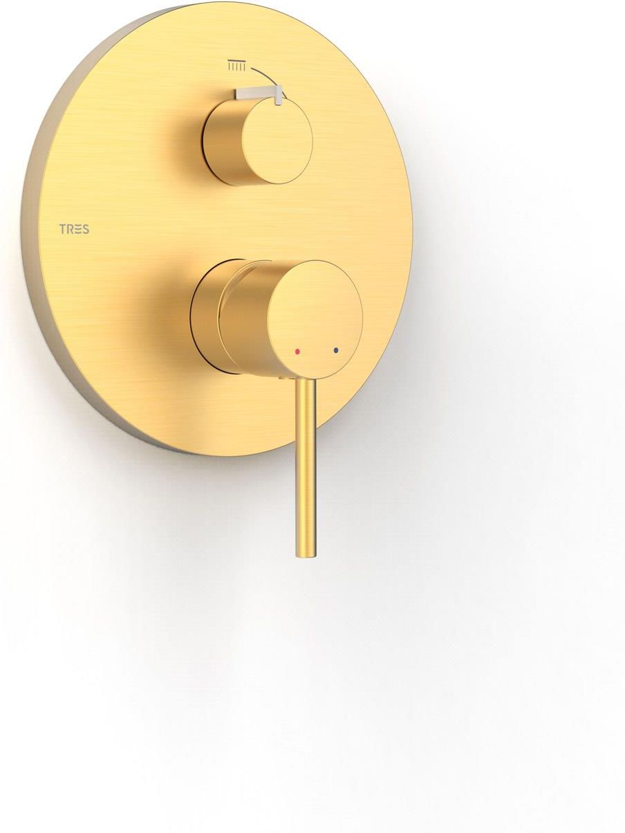 TRES STUDY EXCLUSIVE bateria wannowo-natryskowa podtynkowa, 24-k złoto matowe Gwarancja Producent udziela 5-letniej gwarancji na baterie oraz 2 lata na pozostałe elementy. Główne cechy: - kolor: 24-k złoto matowe - rodzaj: wannowo-natryskowa - typ: jednouchwytowa - montaż: podtynkowa - automatyczny przełącznik natrysk/wanna - zawiera płytę dekoracyjną, uchwyt, pokrętło i ukrytą śrubę mocującą - uzupełnienie do wpuszczanego korpusu Rapid-box Dane techniczne: - średnica rozety: 213 mm W zestawie brak elementu podtynkowego TRES RAPID BOX (20828110), który należy zakupić oddzielnie.