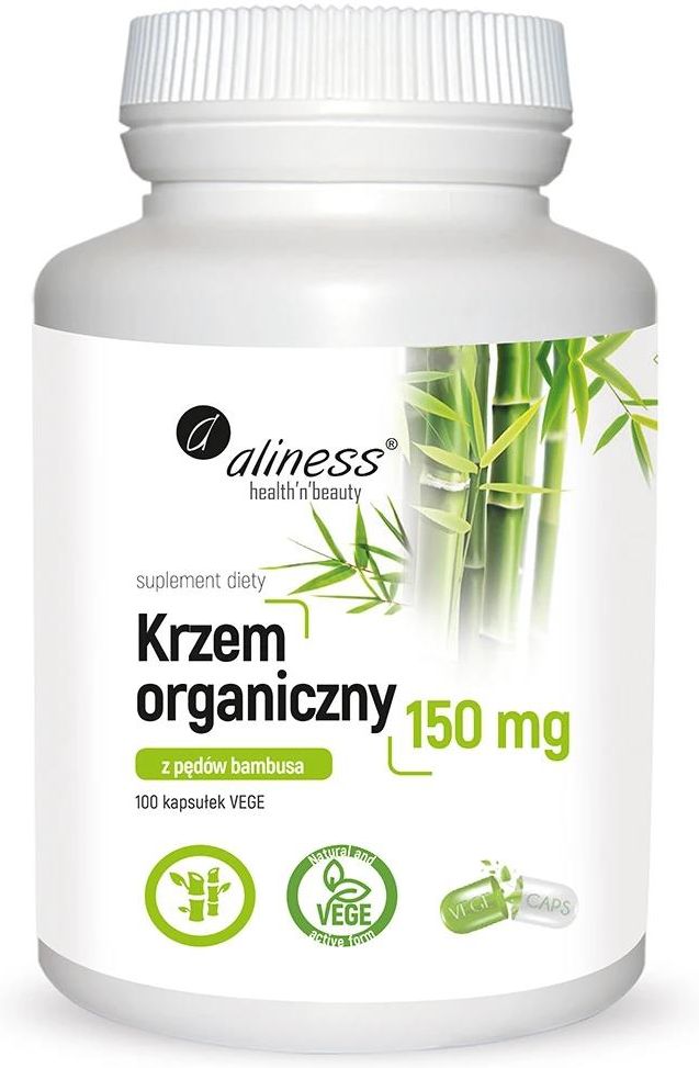 Aliness Krzem organiczny z pędów bambusa 150mg 100 kaps Suplement diety Aliness Krzem organiczny z pędów bambusa to nowoczesne rozwiązanie dla osób pragnących zadbać o swoje zdrowie i urodę od wewnątrz. Dzięki połączeniu składników aktywnych, ten produkt staje się wartościowym wsparciem w codziennej pielęgnacji. Krzem organiczny zyskał uznanie jako kluczowy składnik odpowiedzialny za zdrowie włosów, paznokci oraz skóry. Suplement ten jest idealnym wyborem dla tych, którzy chcą wzmocnić swoje naturalne piękno oraz wspierać organizm w walce z upływającym czasem. Pojemność i forma Produkt dostępny jest w formie kapsułek, co zapewnia wygodę stosowania. W opakowaniu znajduje się 100 kapsułek, a zalecana dawka to jedna kapsułka stosowana od 1 do 3 razy dziennie, w zależności od indywidualnych potrzeb. Najlepiej przyjmować je podczas posiłku, popijając dużą ilością wody, co ułatwi przyswajanie składników aktywnych oraz korzystnie wpłynie na ich działanie. Skład W składzie suplementu znajduje się ekstrakt z pędów bambusa (Bambusa Vulgaris), który jest standardyzowany na 70% naturalnie występującej krzemionki. W jednej kapsułce znajduje się 215 mg ekstraktu, z czego 150 mg to krzemionka. Dodatkowo, otoczka kapsułki wykonana jest z hydroksypropylometylocelulozy, co sprawia, że produkt jest wegetariański i delikatny dla żołądka. Działanie suplementu Krzem organiczny, kluczowy składnik tego suplementu, pełni wiele istotnych funkcji w organizmie. Jego obecność przyczynia się do: wzmacniania układu kostnego, co jest szczególnie ważne dla osób starszych, u których naturalny poziom krzemu maleje, uelastyczniania naczyń krwionośnych, co sprzyja lepszemu krążeniu i ogólnej kondycji organizmu, wspierania zdrowia włosów, skóry oraz paznokci, co czyni ten suplement idealnym dla osób borykających się z ich osłabieniem, łamliwością czy wypadaniem. Dzięki regularnemu przyjmowaniu tego suplementu, można zauważyć poprawę w wyglądzie oraz kondycji ciała, co przekłada się na większe poczucie pewności siebie. Wskazania do stosowania Suplement rekomendowany jest dla osób, które: chcą poprawić kondycję swoich włosów oraz paznokci, borykają się z problemami skórnymi, takimi jak suchość czy utrata jędrności, pragną wzmocnić układ kostny, zwłaszcza w miarę upływu lat, szukają naturalnych metod na poprawę elastyczności naczyń krwionośnych. Kluczowe zalety suplementu Krzem organiczny z pędów bambusa oferuje szereg korzyści, które przyciągają uwagę wielu konsumentów: wzmacnia układ kostny, co jest kluczowe w procesie starzenia się organizmu, uelastycznia naczynia krwionośne, poprawiając krążenie, wspiera zdrowie włosów, skóry i paznokci, przywracając im blask i siłę, działa jako naturalny środek wspomagający w walce z osłabieniem ciała, bezpieczna formuła - wegetariańskie kapsułki delikatne dla żołądka. Dawkowanie Aby uzyskać optymalne efekty, zaleca się stosowanie 1 kapsułki 1-3 razy dziennie. Kluczowe jest, aby przyjmować ją w trakcie posiłków, co sprzyja lepszemu wchłanianiu składników aktywnych. Pamiętaj, aby popijać kapsułkę dużą ilością wody, co ułatwi proces trawienia. Przeciwwskazania i bezpieczeństwo Przed rozpoczęciem suplementacji krzemem warto zwrócić uwagę na ewentualne przeciwwskazania. Osoby, które są w ciąży, karmiące piersią, bądź mające alergię na którykolwiek ze składników produktu, powinny skonsultować się z lekarzem przed jego zastosowaniem. Podobnie, osoby z chorobami przewlekłymi również powinny zasięgnąć porady medycznej. Ważne jest także, aby nie przekraczać zalecanej dawki, aby uniknąć ewentualnych skutków ubocznych. Informacje/cechy dodatkowe Krzem organiczny z pędów bambusa wyróżnia się kilkoma istotnymi cechami, które przyciągają uwagę świadomych konsumentów. Produkt jest wegetariański, co sprawia, że jest dostępny dla osób stosujących różne diety. Dodatkowo, kapsułki są delikatne dla żołądka, eliminując ryzyko nieprzyjemnych doznań podczas ich przyjmowania. Brak sztucznych dodatków, parabenów, sulfatów oraz ftalanów sprawia, że jest to wybór przyjazny dla skóry oraz zdrowia.