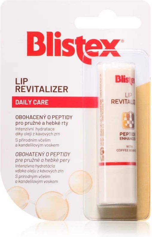 Blistex Lip Revitalizer, 3.7 g, Balsamy do ust dla kobiet, Delikatna skóra ust jest codziennie wystawiana na różne niekorzystne czynniki, zaczynając od częstego kontaktu z jedzeniem aż po niekorzystne warunki pogodowe. Dlatego też zasługuje na specjalne traktowanie. Balsam do ust Blistex Lip Revitalizer jest niezbędnym pomocnikiem w pielęgnacji wrażliwej skóry ust o każdej porze roku. Zapewnia im wszystko, czego potrzebują, aby mogły pozostać nawilżone, miękkie i chronione przed wysuszeniem i pękaniem. Właściwości: głęboko nawilża i intensywnie odżywia chroni usta przed wpływami zewnętrznymi nadaje ustom miękkość i delikatność regeneruje popękane usta przynosi ustom natychmiastowy komfort wspiera tworzenie kolagenu Skład: testowany dermatologicznie peptydy – mają właściwości nawilżające, wygładzające i zmiękczające, pomagają zmniejszyć widoczność zmarszczek, wspomagają jędrność i elastyczność skóry, nadają zdrowy, równy i promienny wygląd oraz wzmacniają barierę skórną Sposób użycia: Nanieś na usta kiedykolwiek w ciągu dnia w razie potrzeby.