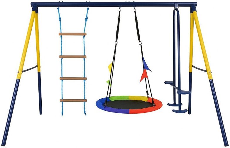 Wszechstronna huśtawka dla dzieci Ogrodowa huśtawka to doskonałe rozwiązanie, które zapewni dzieciom godziny radosnej i aktywnej zabawy na świeżym powietrzu. Zestaw łączy w sobie funkcje klasycznej huśtawki, drabinki wspinaczkowej oraz wygodnego siedziska w formie bocianiego gniazda, oferując różnorodne możliwości spędzania czasu. To idealny wybór dla maluchów, które uwielbiają ruch, pomagając im rozwijać sprawność fizyczną i koordynację ruchową podczas wesołej zabawy. Solidna konstrukcja i bezpieczeństwo Bezpieczeństwo Twoich dzieci jest dla nas najważniejsze. Dlatego ta huśtawka została zaprojektowana z myślą o maksymalnej stabilności i trwałości. Rama wykonana z malowanej proszkowo stali gwarantuje solidność konstrukcji i jest odporna na zmienne warunki atmosferyczne. Wszystkie elementy, takie jak drabinka czy siedziska, są odpowiednio zabezpieczone, a użyte materiały są całkowicie bezpieczne i przyjazne dla dzieci. Możesz być spokojny o ich zdrowie podczas każdej zabawy. Zabawa, która rozwija sprawność fizyczną Ten zestaw został stworzony, aby wspierać harmonijny rozwój fizyczny dzieci. Oprócz klasycznego huśtania, maluchy mogą korzystać z drabinki, doskonaląc zręczność, siłę i koordynację. Duże okrągłe siedzisko o średnicy 100 cm w formie bocianiego gniazda zapewnia komfortową przestrzeń do wspólnej zabawy w grupie, zachęcając dzieci do interakcji i współpracy. To fantastyczne narzędzie do rozwijania kluczowych umiejętności motorycznych poprzez zabawę. Łatwy montaż i trwałość na lata Montaż huśtawki jest prosty i intuicyjny, co pozwala na szybkie przygotowanie miejsca do zabawy. Konstrukcja charakteryzuje się wysoką trwałością i odpornością na czynniki pogodowe, co gwarantuje długie lata użytkowania. Dzięki zastosowaniu materiałów wysokiej jakości, huśtawka jest odporna na rdzę, uszkodzenia mechaniczne oraz wahania temperatur, świetnie sprawdzając się przez cały rok. Jest również łatwa do utrzymania w czystości, co czyni ją niezwykle praktycznym elementem wyposażenia ogrodu.