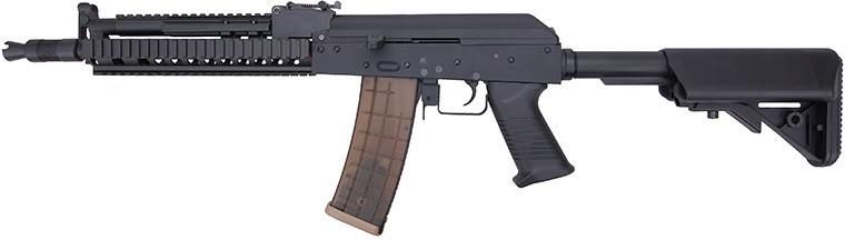 Replika karabinka GE17 Replika GE17 wykonana zastała ze stali, ZnAlu oraz tworzywa sztucznego, z zachowaniem najwyższej dbałości o szczegóły i precyzji wykonania. Ze stali wykonano cały korpus wraz z pokrywą, selektor ognia oraz większość drobnych elementów. Jednolity stop cynku i aluminium wykorzystany został natomiast do wytworzenia zespołu szyn RIS pokrywających niemal całą długość lufy repliki, prowadnicy kolby, lufy zewnętrznej, mechanicznych przyrządów celowniczych oraz niektórych drobnych elementów. Zespół szyn RIS pokrywa cały front repliki. Dzięki ich zastosowaniu, możliwe stało się przyłączenie do repliki niemal dowolnego dodatkowego osprzętu zgodnego ze standardem RIS. Lista jest długa, zaczynając od chwytów przednich, poprzez laserowe znaczniki celu, latarki taktyczne, kolimatory i lunety aż po podczepiane wyrzutnie granatów 40 mm. Ostatnim, rzadko spotykanym i z tego względu wartym nadmienienia elementem jest obustronny uchwyt dźwigni przeładowania. Nie da się ukryć, iż w przypadku repliki pełni on funkcję raczej kosmetyczną niż autentycznie użytkową - niemniej dodaje replice dodatkowego "charakteru", pozwalając jej jeszcze bardziej wyróżnić się na tle innych replik. Warto wspomnieć również o chwycie pistoletowym. Zamontowany został w niej chwyt standardowo dedykowany do M249. Wewnętrznie, replika nie ustępuje wykonaniu zewnętrznemu. Zaopatrzona w wytrzymały i cieszący się zasłużoną renomą gearbox v.3 gwarantuje długą i bezawaryjną pracę. Zainstalowano tu również regulowany system Hop-Up, umożliwiający znaczne wydłużenie toru lotu pocisku. W połączeniu ze sprężyną główną M120 pozwalająca wygenerować początkową prędkość wylotową rzędu 400 FPS pozwoliło to uzyskać znaczny efektywny zasięg i moc, które uznać należy za optymalne w przypadku repliki karabinu szturmowego. Zestaw nie zawiera akumulatora ani ładowarki. Dodatkowe akcesoria widoczne na zdjęciach nie wchodzą w skład zestawu. W skład zestawu wchodzi:- replika - magazynek