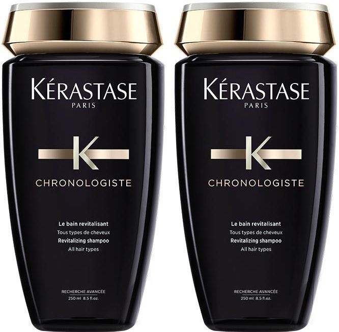 W skład zestawu wchodzą 2 opakowania kąpieli Kérastase Chronologiste Bain, każde o pojemności 250ml. Dzięki nowoczesnej formule wzbogaconej o cenne składniki aktywne, kąpiel Kérastase Chronologiste Bain rewitalizuje i odżywia wszystkie rodzaje włosów, zwłaszcza te dojrzałe i starzejące się. Posiada działanie oczyszczające i odświeżające skórę głowy. Kérastase Chronologiste Bain łączy wygładzanie z odżywieniem, otaczając włosy niewidzialną ochroną i pozostawiając je jednocześnie elastyczne i miękkie. Właściwości kąpieli Kérastase Chronologiste Bain: - Zapobiega oznakom starzenia się - Oczyszcza i myje skórę głowy - Wygładza i wzmacnia włókna włosów - Odżywia i regeneruje skórę głowy - Zwiększa witalność włókna włosów - Zapewnia sprężystość i lekkość fryzury - Włosy odzyskują energię i naturalny połysk