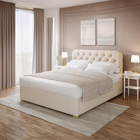 Tapicerowane łóżko kontynentalne Tisso New Concept z pikowanym zagłówkiem o wzorze rombów, wyposażone w pojemnik na pościel.