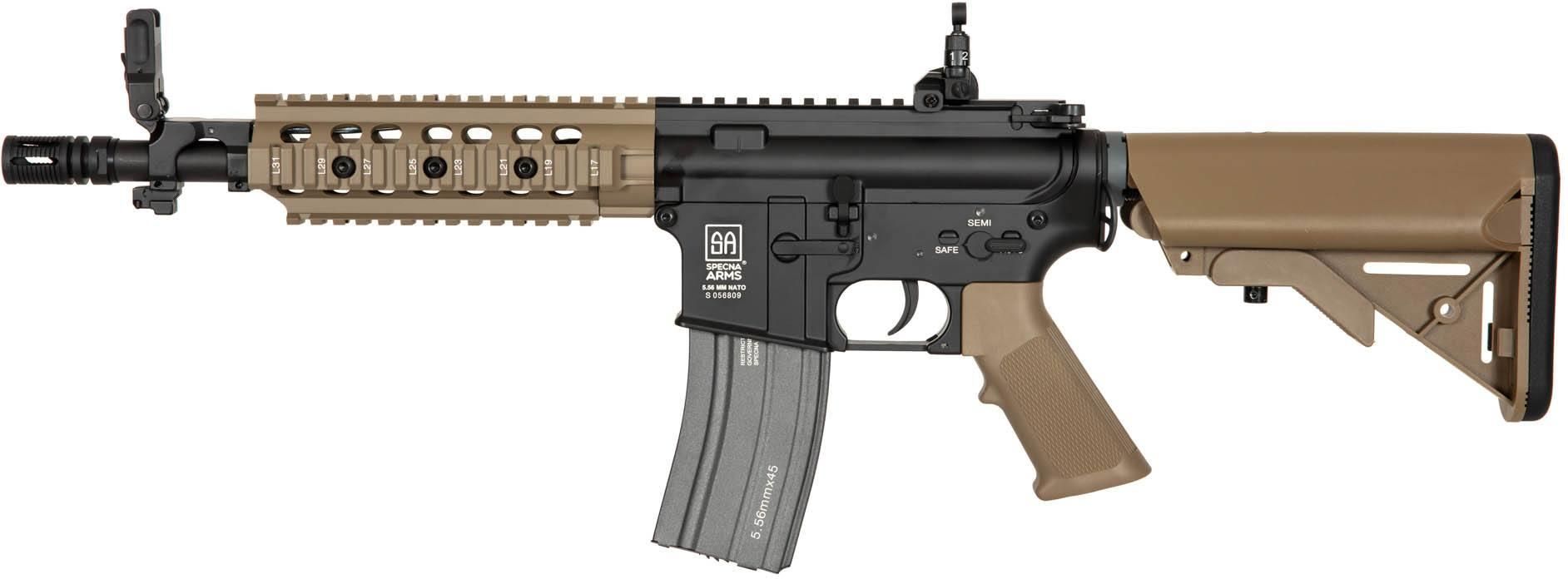 Replika karabinka Specna Arms SA-B04 - Half-TanReplika karabinka SA-B04 marki Specna Arms wykonana została w przeważającej części z jednolitego stopu cynku i aluminium, z zastosowaniem elementów stalowych w najbardziej newralgicznych punktach repliki (stalowe są wiec wszystkie śruby, piny oraz …