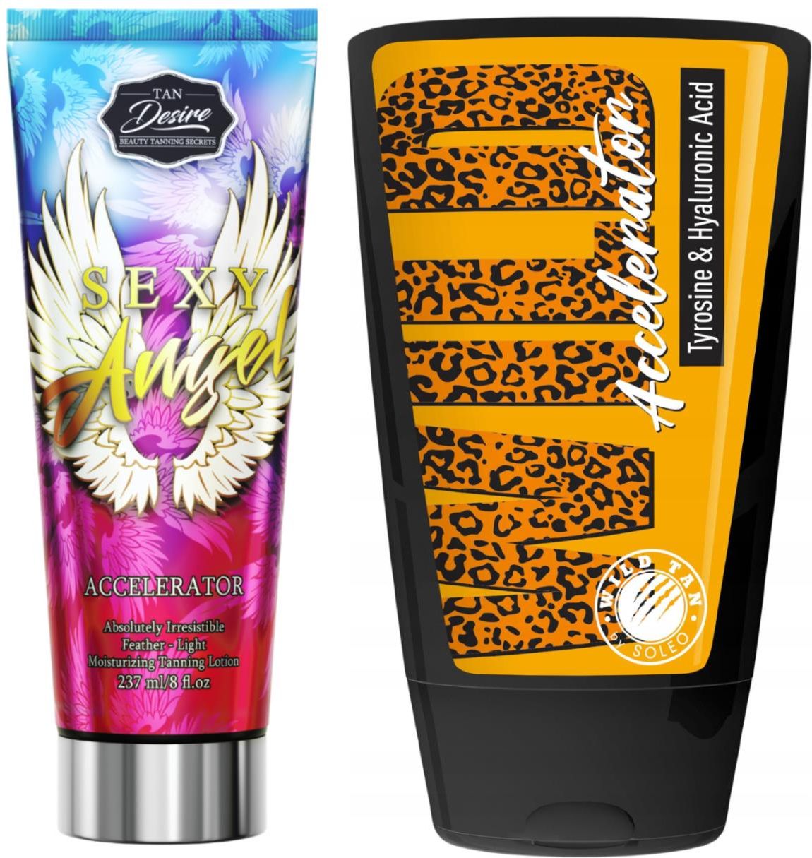 Tan Desire Sexy Angel + Wild Tan Wild GratisTan Desire Sexy Angel Przyspieszacz Z Pantenolem 237mlZachwycający swą formułą przyspieszacz opalania, który otuli Twoją skórę feerią egzotycznych zapachów. Dwie formy aktywnej tyrozyny przyspieszą proces powstawania opalenizny o wspaniałym, naturalnym odcieniu, a aloes wraz z pantenolem i PCA (składnik naturalnie występujący w skórze o dużej zdolności zatrzymywania wody), z ogromną skutecznością zatroszczą się o odpowiednie nawilżenie skóry i jej komfort. Masło Shea i witaminy zapewnią regenerację i skuteczne działanie przeciwstarzeniowe. Ultra lekka, aksamitna formuła kosmetyku pozostawia skórę doskonale wygładzoną i nawilżoną.Przyspieszacz z pantenolem Tan Desire Sexy Angel rekomendowany dla: osób z jasną karnacją oraz dla osób, które rozpoczynają przygodę z opalaniem lub opalają się nieregularnieSposób użycia: Bezpośrednio przed opalaniem nanieś równomierną warstwę na całą powierzchnię ciała. Po aplikacji, umyj dokładnie ręce! Pamiętaj, że produkt przeznaczony jest wyłącznie do użytku zewnętrznego. Aby skutecznie wzmacniać i zachować na opaleniznę dłużej używaj każdorazowo przed wizytą w solarium.Zapach: pure angelWild Tan Wild Accelerator Przyspieszacz Z Kwasem Hialuronowym 125mlBalsam do opalania o szybkim działaniu nawilżającym i brązującym. Kwas hialuronowy poprawia strukturę skóry, zapewniając jej intensywne nawilżenie i równowagę.Zapach: Hawaii flowerPojemność: 125ml