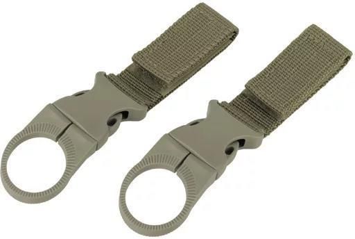Zestaw dwóch sztuk montaży do transportu butelek typu PET na taśmach MOLLE/PALS lub pasku. Konstrukcja pozwala na szybkie wypięcie butelki. Całość wykonano z trwałej nylonowej taśmy oraz polimerowej klamry. Kolor: zielony OD