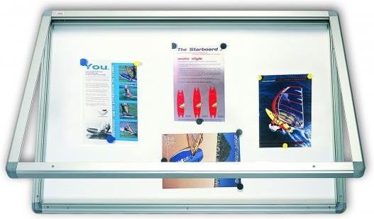 Gablota informacyjna przeznaczona do użytku wewnątrz budynków. Rama wykonana z profilu aluminiowego anodowana na kolor srebrny, wykończona plastikowymi, popielatymi narożnikami. Tył tablicy wzmocniony blachą ocynkowaną. Drzwiczki wykonane z pleksi, zamykane na kluczyk imbusowy Specyfikacja …