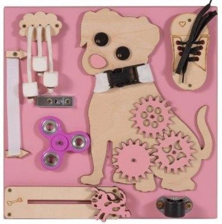 Tablica manipulacyjna Pies Hugo Wyposażenie: ruchome kółka zębate koraliki zwisające z chumury but ze sznurówką (nauka sznurowania) pies z obrożą (nauka zapinania) rzep zasuwka spiner ruchome kółko do mebli ścieżka z ruchomym pieskiem