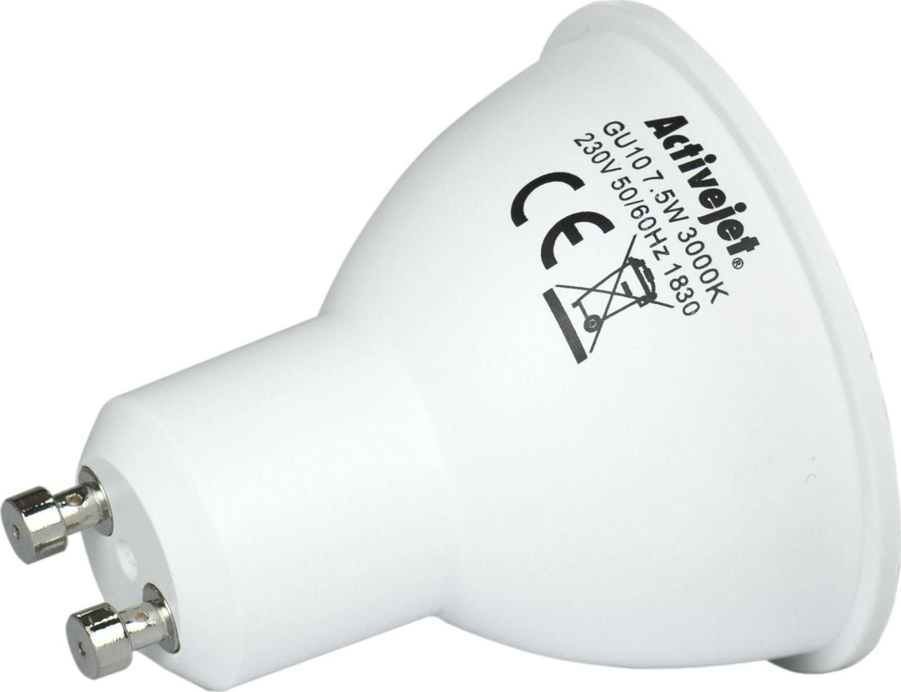 - rodzaj: LED - rodzaj gwintu: GU10 - typ diod: SMD - kształt halogenu/żarówki: punktowa - liczba diod: 36 - moc strumienia światła: 600 lm - kąt świecenia: 120 stopni - temperatura koloru: 3000 K - kolor światła: biały ciepły - czas świecenia: 30000 h - certyfikaty i klasy szczelności: CE, RoHS - pobór mocy (włączony): 7,5 W