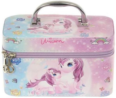KUFEREK JEDNOROŻEC ROZMIAR S Duży kuferek, kosmetyczka na biżuterię, kosmetyki czy inne skarby dziewczynek. Zewnętrzna strona wykonana z materiału imitującego skaj z nadrukami dwóch koników, kwiatków, brylancików, tęczy, napisów UNICORN. Kuferek zapinany na suwaki, w środku jedna komora wyłożona …