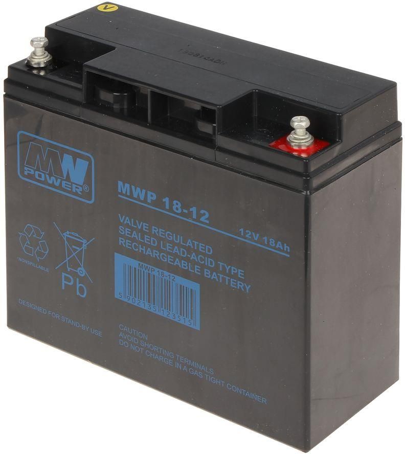 AKUMULATOR AGM 12V 18Ah MWP 18-12 Akumulator AGM (Absorbent Glass Mat) to zaawansowany typ akumulatora ołowiowego, w którym elektrolit jest zamknięty w matce z włókna szklanego pomiędzy płytami. Charakteryzują się one długą żywotnością, wysoką wydajnością i są odporne na głębokie rozładowania. Są idealne do zastosowań wymagających dużej mocy i niezawodności. Model: AKUMULATOR AGM 12V 18Ah MWP 18-12 Napięcie: 12V Pojemność: 18Ah Żywotność: 6-9 lata Wymiary (Dł x Szer x Wys): 181mm x 77mm x 167mm Wysokość całkowita: 167mm Waga: 5.90kg Złącze: M5 Cecha: MWP przeznaczone są do pracy w systemach awaryjnego tworzenia kopii zapasowych, a także w innych zastosowaniach wymagających cyklicznych warunków pracy. Zastosowanie: ładowarki UPS, systemy automatyki lub jako źródło zasilania urządzeń mobilnych urządzenia, silniki elektryczne i inne obciążenia pracujące w trybie cyklicznym. Wysoka pojemność i trwałość to tylko niektóre z zalet modelu AKUMULATOR AGM 12V 18Ah MWP 18-12.