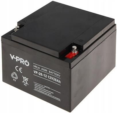 AKUMULATOR 12V/26AH-VPRO V-PRO Pojemność akumulatora: 26 Ah ; Napięcie znamionowe: 12 V ; Typ akumulatora: Bezobsługowy akumulator AGM (Absorbent Glass Mat) ; Żywotność akumulatora: 8 ... 10 lat ; Waga: 7.3100 Długość: 185 Szerokość: 175 Wysokość: 145 Bezobsługowy akumulator AGM (Absorbent Glass Mat) Pojemność akumulatora:26 AhNapięcie znamionowe:12 VPrąd ładowania akumulatora:max. 7.8 AZłącze:śruba M5Typ akumulatora:Bezobsługowy akumulator AGM (Absorbent Glass Mat)Żywotność akumulatora:8 ... 10 latWaga:7.12 kgWymiary:175 x 125 x 166 mmProducent / Marka:V-PROGwarancja:2 lata