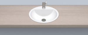 Umywalka wpuszczana w blat, okrągła, średnica 450 mm, obustronnie emaliowana, do montażu od góry, z otworem na baterię i przelewem, łącznie z zestawem mocującym i przelewowym