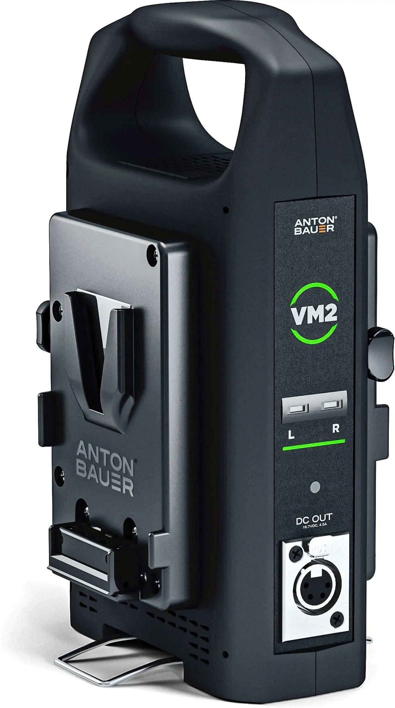 Anton Bauer VM2 Dual V-Mount Battery Charger Intelligent charging with power to spare. Charge two V-Mount batteries simultaneously while powering your camera accessories with the lightweight and portable Anton/Bauer VM2 battery charger. Lithium-ion batteries, like the Anton/Bauer GO 90 (98Wh 10A) charge in approximately 3 hours. The XLR4 output converts AC to DC power when charging or can be used to deliver battery power to devices that only have an XLR input. Lightweight, compact dual battery charger The portable, packable charging solution A power-up wherever you need it. With two V-Mount battery mounts and an XLR4 DC output the Anton/Bauer VM2 charger is the ideal solution for roaming imagemakers. Simply connect to AC power and pop the integrated support stand to create a quick-to-set-up plug and play charging station for V-mount batteries, and a 15VDC 4A convertor for XLR power input devices. The slim profile is designed to stack and pack, perfect for transportation when space matters. Advanced safety monitoring Protection your batteries and devices Stays cool in the heat of the action. VM2 chargers are designed to protect your batteries and any powered devices from damage. Intelligent safety technology in the VM2 constantly monitors all devices and will automatically stop charging if a fault is detected or any attached battery reaches an overvoltage condition. A built-in fan ensures that the charger can be relied on for peak performance when things start heating up on set. Manufacturer Anton Bauer Charger battery slots 2 Battery mount V-Mount Input power AC Input Power: 100 to 240 VAC, 50 / 60 Hz at 1.5 A Output power Output Voltage (via AC power): 16.7 VDC at 4.5 A (4-Pin XLR Female), Output Voltage (via battery / batteries): 15 VDC at 4 A (4-Pin XLR Female) Dimensions 235 x 57 x 140 mm Manufacturer Item code 8475-0143 What's in the box Anton Bauer Dual V-Mount Charger 4 Pin XLR Cable (Length ~10 ft. / 3 meters)