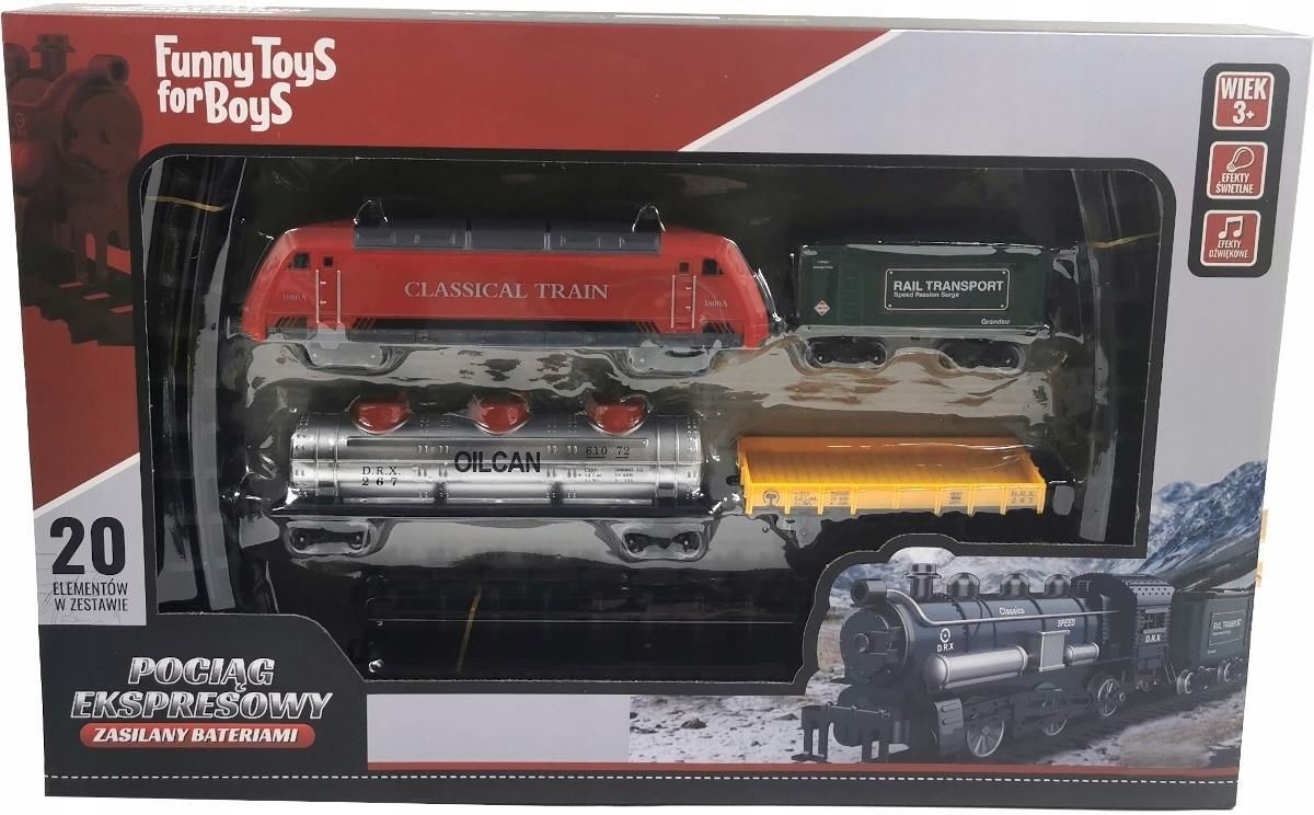 1173752 LOKOMOTYWA KOLEJKA POCIĄG Z TORAMI ARTYK 1173752 LOKOMOTYWA KOLEJKA POCIĄG Z TORAMI ARTYK Wspaniała zabawka dla małych miłośników kolejek! Połącz wagoniki z lokomotywą, ustaw pociąg na torze i zobacz jak pędzi przed siebie! Kolorowa lokomotywa z doczepianymi wagonikami. Podczas jazdy świeci przednim światłem i wydaje odgłosy jadącego pociągu a jej koła napędowe wyposażone są w gumki zapobiegające ślizganiu się kolejki po torach. Precyzyjnie odwzorowany wygląd lokomotywy, wagoników i pozostałych elementów, a także atrakcyjna kolorystyka, przyciągną uwagę każdego dziecka, zapewniając mu długie godziny fascynujących zabaw. Ta wielofunkcyjna zabawka edukacyjna jednocześnie rozwija wyobraźnię, zdolności manualne oraz koordynację ruchową dziecka. Długość trasy: 145 cm Wymagane baterie: 2x AA (nie dołączono) Wiek: 3+ Wymiary opakowania: 49cm x 32cm x 5,5cm