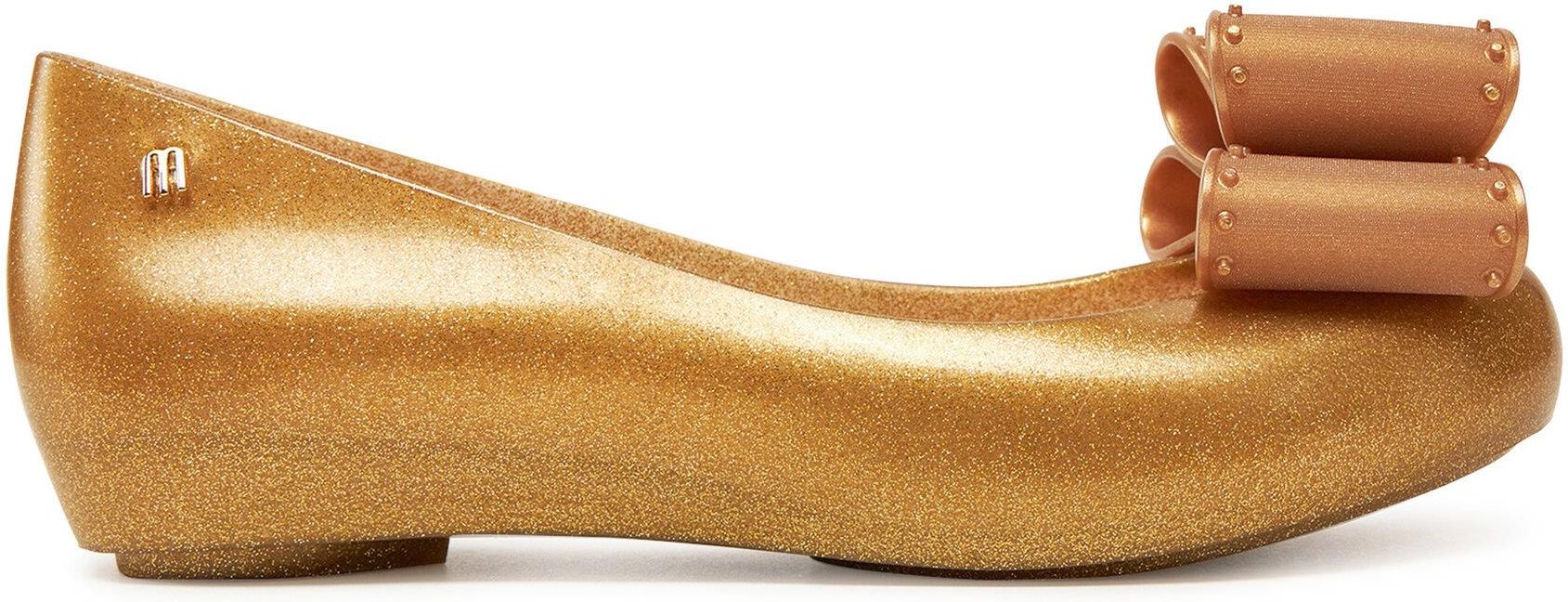 Baleriny marki Melissa w złotym kolorze to kwintesencja stylu i wygody. Wykonane z innowacyjnego tworzywa Mel-Flex, idealnie dopasowują się do kształtu stopy, zapewniając komfort podczas noszenia przez cały dzień. Okrągły nosek nadaje im klasyczny, subtelny wygląd, który świetnie uzupełni zarówno casualowe, jak i bardziej eleganckie stylizacje. Te baleriny to doskonały wybór dla kobiet, które cenią sobie nie tylko modny design, ale także praktyczność i trwałość w codziennym użytkowaniu.
