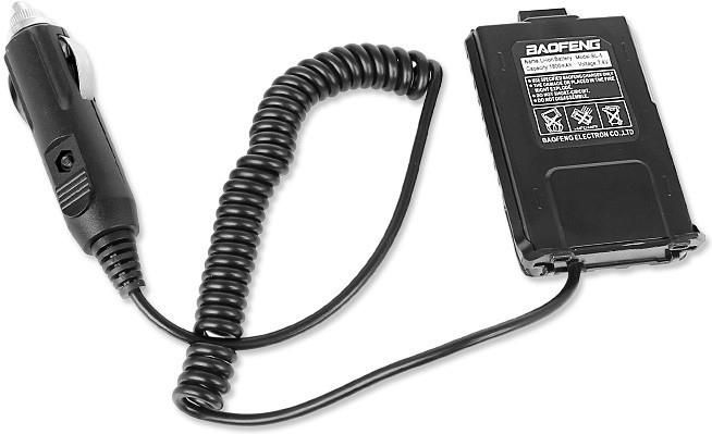 Eliminator akumulatora przeznaczony do radiotelefonu ręcznego Baofeng UV-5R, UV-8HX i podobnych. Pozwala na zasilanie radiotelefonu z gniazda zapalniczki samochodowej. Cechy: - Umożliwia działanie radia bez akumulatora - Zastępcze źródło zasilania - Wtyk do gniazda zapalniczki - Dioda informująca o podłączeniu - Spiralny przewód ułatwiający korzystanie z radiotelefonu - Napięcie zasilania 12V - Kolor: czarny - Waga: 61 g