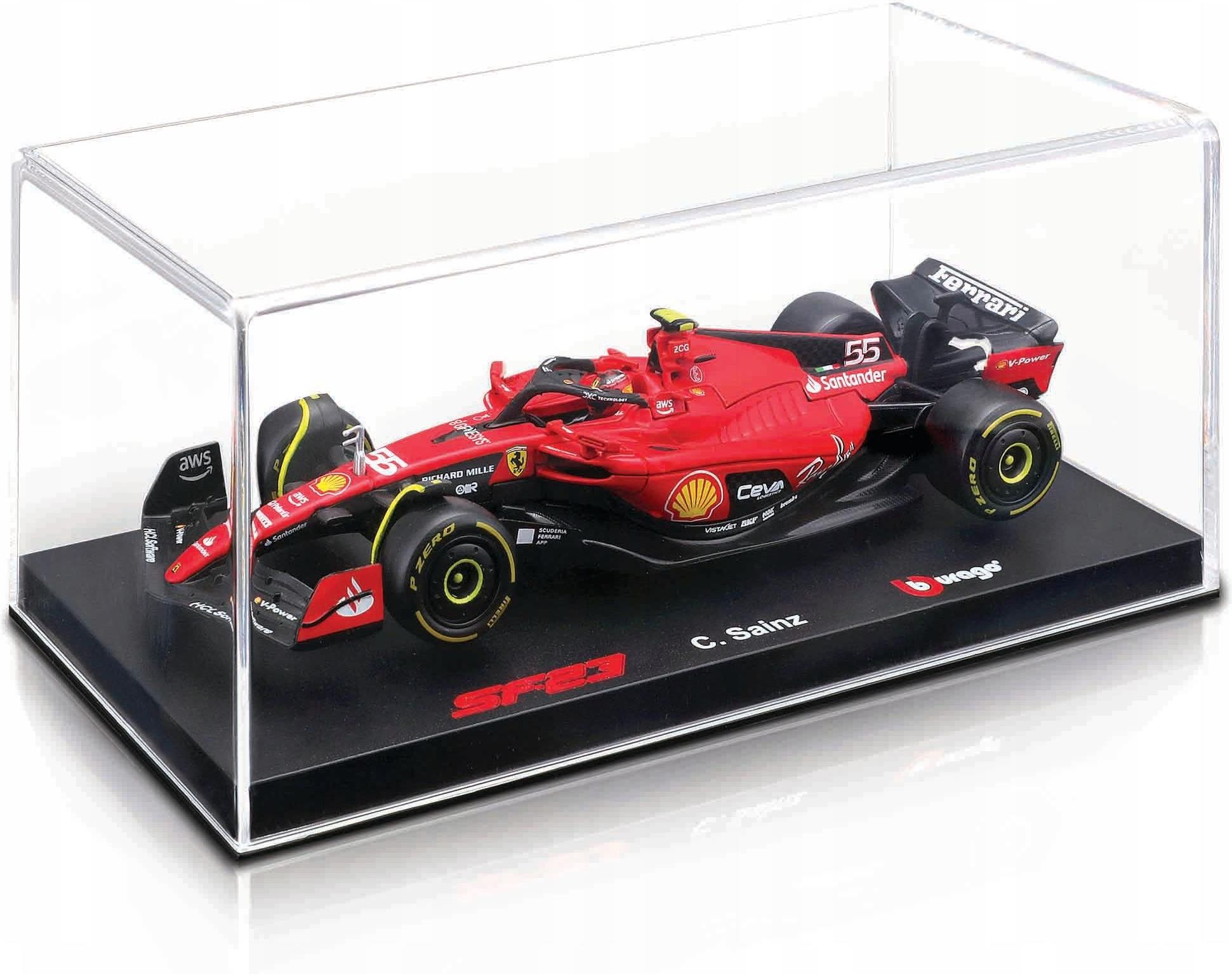 BOLID F1 Ferrari SF-23 (2023) #55 Carlos Sainz oryginalny produkt marki Bburago, oficjalny, licencjonowany wzór pojazdu, metalowy model z plastikowymi elementami, perfekcyjne odwzorowanie szczegółów, model umieszczony na plastikowej podkładce oraz zamknięty w ochronnej gablotce. Wymiary długość 13cm, szerokość 5cm, wysokość 3cm. Wymiary opakowania: 14,5 x 7 x 7cm. Ferrari SF-23 to samochód Formuły 1, stworzony przez Ferrari na sezon 2023, którego głównymi kierowcami są Charles Leclerc i Carlos Sainz. Oficjalna prezentacja odbyła się 14 lutego w Maranello. Tego samego dnia samochód po raz pierwszy wyjechał na tor Fiorano. SF-23 wyróżnia się innowacyjnym projektem przedniego spojlera oraz zastosowaniem tzw. kanału S w sekcjach bocznych, co ma na celu poprawę przepływu powietrza. To świadczy o zaawansowanych rozwiązaniach technologicznych, które Ferrari wdrożyło, dążąc do osiągnięcia doskonałej wydajności i aerodynamiki. Marka Bburago przez lata zdobyła sobie rzesze miłośników i wiernych kolekcjonerów. Aktualnie jest jednym z najpopularniejszych producentów pojazdów do zabawy i kolekcjonowania. Każdy z modeli to idealnie odwzorowana kopia prawdziwego pojazdu. Jakość zastosowanych materiałów oraz szczegółowość modelu zaspokoi najbardziej wymagających odbiorców.