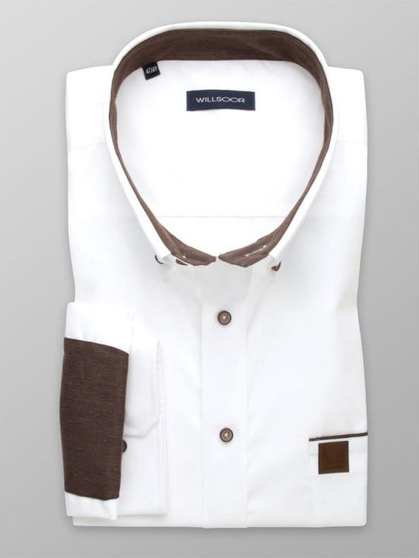 Biała klasyczna koszula o gładkiej fakturze z podpinanym kołnierzykiem, brązowymi kontrastami i nałokietnikami