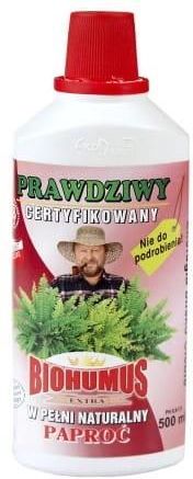 BIOHUMUS EXTRA paproć 0,5 L. Płynny nawóz naturalny. Wzmacnia system samoobrony roślin, warunkuje ich prawidłowy rozwój, powoduje lepsze ukorzenienie, przyspiesza wzrost oraz zapewnia intensywną, świeżą zieleń i ładny pokrój paproci.
