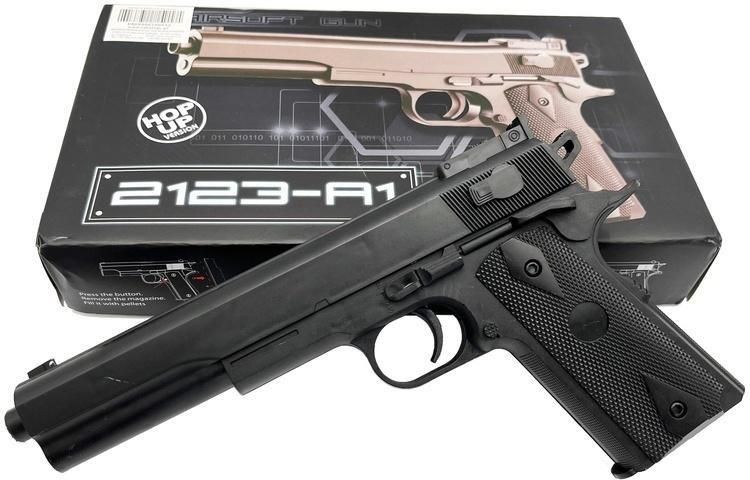 Imitacja broni - Pistolet V82, DOCIĄŻANY 25cm Prezentujemy realistyczną imitację pistoletu wykonaną z solidnego dociążanego plastiku. Produkt jest pakowany w pudełko ze styropianową wytłoczką, co zapewnia jego bezpieczeństwo podczas transportu. Pistolet ma długość 19 cm i waży 220 g, co sprawia, że jest wygodny w użyciu i dobrze leży w dłoni. Strzela plastikowymi kulkami o średnicy 6 mm, co czyni go idealnym do zabawy i treningu. Dodatkowo, pistolet posiada wyciągany magazynek, co zwiększa realizm i funkcjonalność zabawki. Idealny dla kolekcjonerów, miłośników militariów oraz do zabawy na świeżym powietrzu. Cechy produktu: Solidne wykonanie: Pistolet wykonany z wysokiej jakości tworzywa sztucznego, odpornego na uszkodzenia. Bardziej realistyczna waga: Dociążony tak aby chwyt stał się jeszcze bardziej realistyczny. Mechanizm sprężynowy: Ręczne przeładowanie zapewnia większą interaktywność i realizm podczas zabawy. Wyjmowany magazynek: Umożliwia szybkie ładowanie kulkami plastikowymi o średnicy 6mm. Kompaktowy rozmiar: Długość 28cm i waga 270 g sprawiają, że pistolet jest wygodny w obsłudze dla wszystkich użytkowników. Pakowanie: Produkt zapakowany w pudełko z wytłoczką styropianową, co chroni go przed uszkodzeniami podczas przechowywania i transportu. Specyfikacja techniczna: Materiał: Solidne, dociążane tworzywo sztuczne. Mechanizm: Sprężynowy, ręcznie przeładowywany. Amunicja: Kulki plastikowe o średnicy 6mm. Wymiary: Długość 25 cm. Waga: 270 g. Pakowanie: Eleganckie pudełko. W zestawie: Pistolet sprężynowy. Wyjmowany magazynek. Komplet kulek plastikowych na start. Idealny do: Zabawy na świeżym powietrzu lub w domu. Treningów precyzyjnego strzelania. Prezentu dla fanów militariów i realistycznych modeli broni. Dlaczego warto? Pistolet łączy w sobie trwałość, kompaktowe wymiary i funkcjonalność. Jest idealnym wyborem dla osób szukających lekkiej, a jednocześnie solidnej imitacji broni. Dzięki wyjmowanemu magazynkowi i sprężynowemu mechanizmowi, użytkowanie pistoletu staje się przyjemne i realistyczne. Grupa wiekowa: 18+ Opakowanie: pudełko