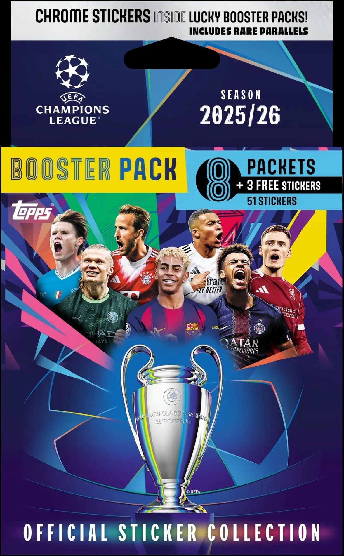 Oficjalna kolekcja naklejkowa UEFA Champions League 2025/26 obejmuje wszystkie 36 zespoły na 574 naklejkach do zebrania w niesamowitym 76 stronicowym albumie. Zawartość boostera: - 8 saszetek z naklejkami ( 6 naklejek w każdej) - 3 gratisowe naklejki RAZEM 51 NAKLEJEK Kategorie naklejek obejmują : - Leading Legacies - Energy Legends - Team of Season - Hat Trick Hereos - i wiele innych