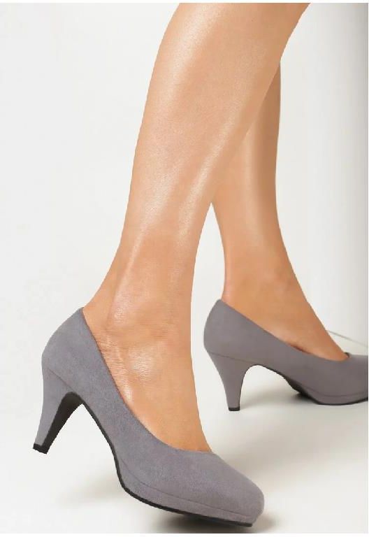 Czółenka Tafenne na stożkowym obcasie, ze smukłym, zaokrąglonym noskiem. Wygodnie wsuwane. Wykonane z gładkiego ekozamszu. Wewnątrz wkładka z ekoskóry. Przy zakupie rekomendujemy wybór rozmiaru o 1 większy. - Kolor: Szary - Rozmiarówka: Kup większe - Tęgość stopy: Neutralny - Rodzaj obcasa: Stożek - Wkładka/wyściółka: Ekoskóra - Materiał: Ekozamsz - Nosek buta: Okrągły - Zapięcie: Wsuwany/otwarty - Sezon: Całoroczny - Wysokość obcasa: 7 cm