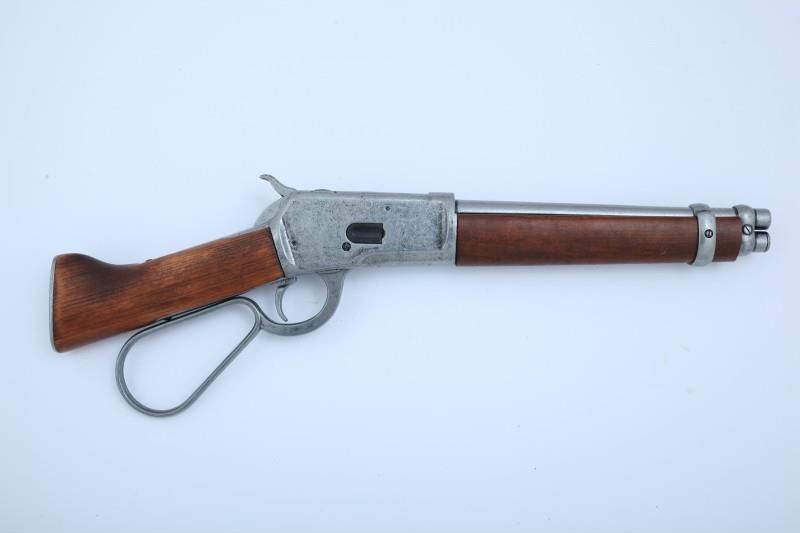 REPLIKA OBRZYN z 1892r USA MARE`S LEG DENIX MODEL 1095 DANE TECHNICZNE: Wspaniała replika obciętego Winchestera, Obrzyna z 1892 roku. Wykonana jest ze stopu ZnAl w kolorze starego srebra. Posiada sprawny mechanizm dźwigniowy, dzięki czemu można oddać tzw. suchy strzał. Ruchoma pokrywa zamka, która …