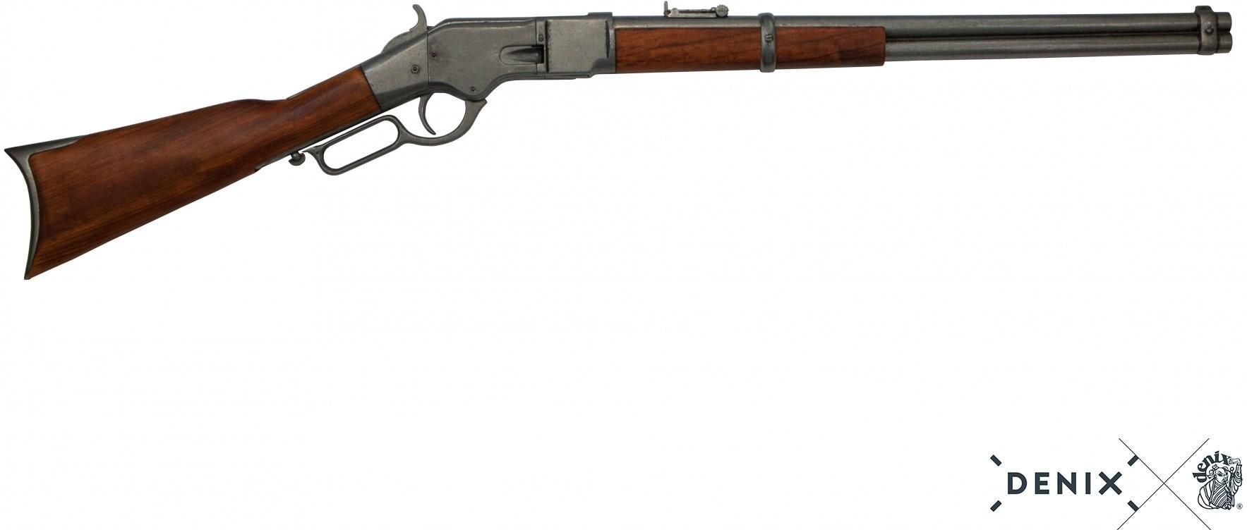 REPLIKA WINCHESTER z 1858 roku (USA 1866) DENIX MODEL 1140 G DANE TECHNICZNE: Prezentowana replika bardzo dokładnie odzwierciedla oryginał słynnego Winchestera z 1866 roku wykonana z drewna i zmatowionego cynkalu. Elementy mechanizmu są ruchome - umożliwiają np. oddanie suchego strzału. Materiał: …