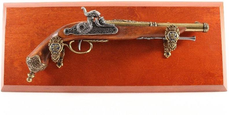 REPLIKA PISTOLETU BRESCIA z 1825 roku NA TABLO DENIX MODEL 1013L+TM+23 DANE TECHNICZNE: Prezentowana replika NA TABLO bardzo dokładnie odzwierciedla oryginał. W całości wykonana z metalu oraz drewna. Metalowe wykończenia oraz lufa odlane ze zdobieniami charakterystycznymi dla epoki. Mechanizm …