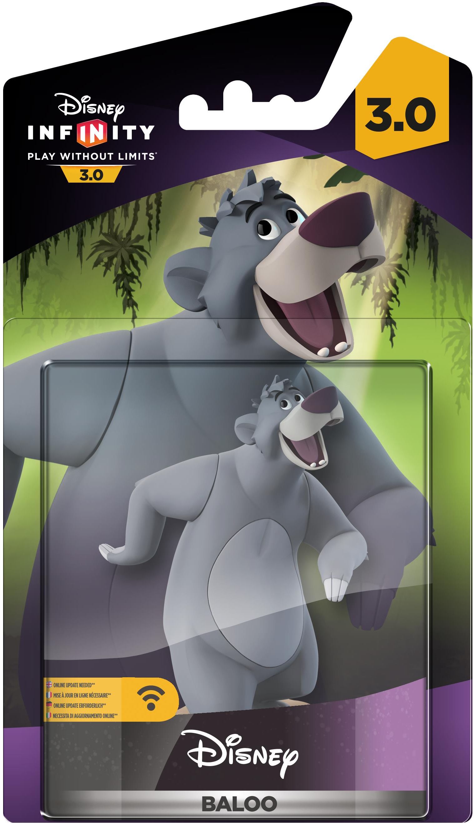 Baloo – najbardziej beztroski miś świata pląsa po dżungli i chroni przyjaciół, rzucając owocami. Do gry wyłącznie na Placu Zabaw. Figurki pasują do gier z serii Infinity 3.0 na konsole PS3, PS4, Xbox 360 oraz Xbox ONE Do gry wyłącznie na Placu Zabaw. Disney Infinity 3.0 dostarcza dzieciom i rodzicom jeszcze bogatszą zawartość i bardziej zróżnicowaną rozgrywkę niż kiedykolwiek wcześniej w serii, wliczając w to: Trzy światy Gwiezdnych Wojen* ? jeden świat z Epizodów I-III*, drugi świat* z oryginalnej trylogii, Epizodów IV-VI, oraz trzeci*, który zostanie udostępniony w zimie, oparty na nadchodzącym filmie Gwiezdne Wojny: Przebudzenie Mocy. Dodatkowe światy* oferujące zróżnicowaną rozgrywkę i różnorodne środowiska, między innymi świat Disney/Pixar oparty na nadchodzącym filmie W głowie się nie mieści, oraz świat Marvela zawierający Iron Mana w zbroi Hulkbuster, Ultrona i inne postacie rodem z komiksów. Usprawniony Plac Zabaw z dwoma nowymi grami w trybie wieloosobowym: wyścigi gokartów oraz akcja-przygoda. Więcej figurek* uwielbianych przez fanów postaci The Walt Disney Company, takich jak Mickey i Minnie, Sam Flynn i Quorra z filmu Tron: Dziedzictwo, Mulan i Olaf oraz wiele innych. *Elementy sprzedawane osobno. Każdy ze światów Gwiezdnych Wojen oferuje inne doświadczenia dzięki zróżnicowanej rozgrywce, miejscom w grze oraz postaciom. Akcja świata Gwiezdne Wojny: Zmierzch Republiki ma miejsce w czasach, kiedy Jedi byli u szczytu potęgi, a gracze będą mogli korzystać z Mocy i mieczy świetlnych w spektakularnych starciach. Swoje umiejętności walki będą rozwijać u boku Ahsoki Tano, Anakina Skywalkera, Obi-Wana Kenobiego, Yody i Dartha Maula. Świat Gwiezdne Wojny: Powstanie Przeciw Imperium zabierze graczy na misje w całej galaktyce razem z Lukiem Skywalkerem, księżniczką Leią Organą, Hanem Solo, Chewbaccą oraz Darthem Vaderem. Umożliwi także pokierowanie myśliwcami X-wing lub Sokołem Millenium, aby walczyć ze szturmowcami lub zwiedzać takie planety jak Tatooine, Hoth czy Endor. Co więcej, fani będą mieli wyjątkową okazję wcielić się we wszystkie postacie z Gwiezdnych Wojen we wszystkich światach Gwiezdnych Wojen. Disney Infinity 3.0 wprowadza także całkowicie nowy Plac Zabaw 3-D, który ułatwi graczom wybieranie różnorodnych gatunków rozrywki ? wliczając w to platformówki, wyścigi oraz symulatory rolnictwa. Dwie nowe gry w trybie wieloosobowym porwą graczy do świata akcji i przygody w oraz wyścigów gokartów, w których dzieci i całe rodziny będą mogły grać popularnymi postaciami Disneya, Disney/Pixar, Marvela i postaciami z Gwiezdnych Wojen ? wszystkimi razem w jednolitym środowisku. Inne światy, figurki oraz gry na Plac Zabaw Disney Infinity 3.0 są sprzedawane osobno. Wszystkie figurki i dyski mocy z wersji 1.0 i 2.0 Disney Infinity są kompatybilne z Disney Infinity 3.0 w usprawnionym Placu Zabaw. Po raz pierwszy dyski mocy będą sprzedawane po cztery sztuki w specjalnych zestawach związanych z danym uniwersum.