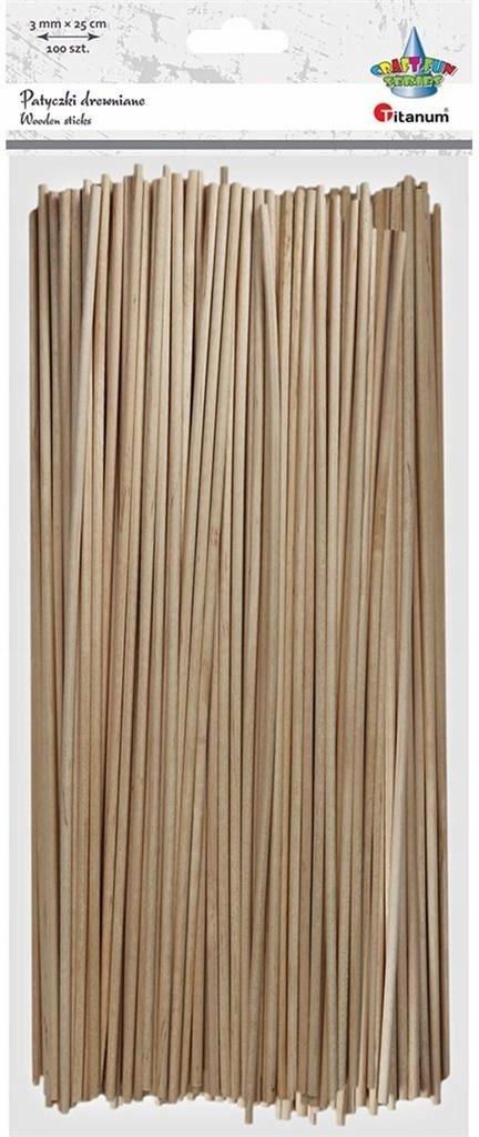 Drewniane patyczki ogkrągłe 3x250mm 100szt Producent: Titanum Kod paskowy (EAN): 5907437666357 Drewniane patyczki okrągłe 3mm 25cm naturalne drewno 100szt.