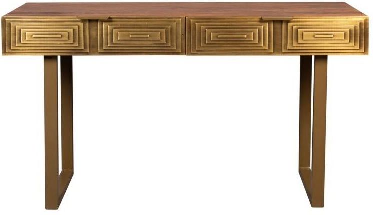 Złota konsola Voland marki Dutchbone to kolejna propozycja, która idealnie wypełni aranżacje w stylu glamour. Fronty biurka pokryte są cienkimi metalowymi płytami, które są fachowo ręcznie wybijanie w wzory wycięte z drewna. Konsola może pełnić funkcję stolik czy też biurka. Wymiary: 140x50x76 cm