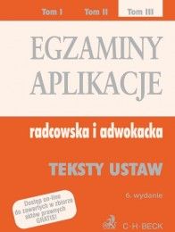 Egzaminy.Aplikacje radcowska i adwokacja, zawiera akty prawne ogłoszone przez Ministerstwo Sprawiedliwości, z których wybrane stanowić będą podstawę opracowania pytań testowych na egzamin radcowski i adwokacki.Tom III:Ustawa o planowaniu i zagospodarowaniu przestrzennymUstawa o samorządowych kolegiach odwoławczychKodeks postępowania administracyjnegoPrawo o postępowaniu przed sadami administracyjnymiTraktat z Lizbony zmieniający Traktat o Unii Europejskiej i Traktat ustanawiający Wspólnotę EuropejskaKonstytucja Rzeczypospolitej PolskiejUstawa o Trybunale KonstytucyjnymUstawa o Sadzie NajwyższymUstawa o Rzeczniku Praw ObywatelskichPrawo o ustroju sadów powszechnychPrawo o ustroju sadów administracyjnychUstawa o prokuraturzePrawo o adwokaturzeKodeks Etyki AdwokackiejRozporządzenie w sprawie wysokości oraz szczegółowych zasad pobierania wpisu w postępowaniu przed sadami administracyjnymiRozporządzenie w sprawie sposobu uiszczania opłat sadowych w sprawach cywilnychRozporządzeniew sprawie opłat za czynności adwokackie oraz ponoszenia przez Skarb Państwa kosztów nieopłaconej pomocy prawnej udzielonej z urzęduUstawa o Krajowym Rejestrze SadowymUstawa o samorządzie gminnymUstawa o wojewodzie i administracji rządowej w województwieUstawa o samorządzie powiatowymUstawa o samorządzie województwaPrawo ochrony środowiskaUstawao udostępnianiu informacji o środowisku i jego ochronie, udziale społeczeństwa w ochronie środowiska oraz o ocenach oddziaływania na środowiskoUstawa o postępowaniu egzekucyjnym w administracjiUstawa o radcach prawnychKodeks Etyki Radcy PrawnegoUstawa o świadczeniu przez prawników zagranicznych pomocy prawnej w Rzeczypospolitej PolskiejUstawao skardze na naruszenie prawa strony do rozpoznania sprawy w postępowaniu przygotowawczym prowadzonym lub nadzorowanym przez prokuratora i postępowaniu sądowym bez nieuzasadnionej zwłokiUstawa o Trybunale StanuUstawa o nabywaniu nieruchomości przez cudzoziemcówUstawa o świadczeniach rodzinnych