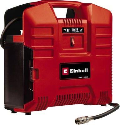 Kompresor marki EINHELL. Akumulatory z wysokiej jakości ogniwami litowo-jonowymi można łączyć ze wszystkimi członkami rodziny Power X-Change. Bezprzewodowa sprężarka skrzyniowa jest małym, ale wydajnym pomocnikiem w zastosowaniach do maksymalnie 8 barów. Dzięki temu nadaje się np. do szybkiego pompowania opon rowerowych, samochodowych i motocyklowych. Nawet wymagające opony do rowerów szosowych nie stanowią problemu dla bezprzewodowej sprężarki dzięki mocnej pompie. Ergonomiczny kształt i praktyczny uchwyt zapewniają mobilność i łatwy transport. Bezolejowa, bezobsługowa pompa wymaga niewielkiej konserwacji. Schowek na wąż sprężonego powietrza jest zintegrowany z obudową. Miernik ciśnienia w oponach można wygodnie schować na obudowie. Zakres dostawy obejmuje 2,50-metrowy wąż sprężonego powietrza z szybkozłączem, adapter do zastosowania jako pistolet do przedmuchiwania, miernik ciśnienia w oponach i trzyczęściowy zestaw adapterów. Zestaw nie zawiera baterii ani ładowarki, są one dostępne do zakupienia osobno. Brak akumulatora i ładowarki w zestawie.