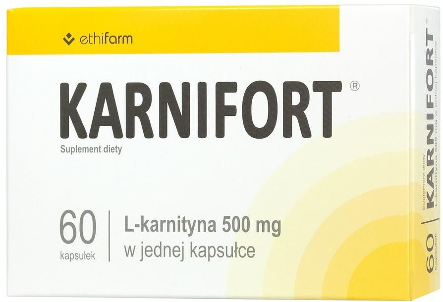 Opis Karnifort - suplement diety zawierający 500 mg L-karnityny w jednej kapsułce. Produkt przeznaczony dla osób dorosłych. Skład L-karnityna, składnik otoczki (żelatyna), woda oczyszczona, substancja przeciwzbrylająca (sole magnezowe kwasów tłuszczowych), barwniki (dwutlenek tytanu - E 171, tlenek żelaza żółty - E 172, tlenek żelaza czerwony - E 172). Składnik 2 kapsułki L-karnityna 1000 mg Dawkowanie Dorośli: 1 kapsułka 2 razy dziennie. Przeciwwskazania Preparatu nie należy stosować przy nadwrażliwości na którykolwiek ze składników. Nie należy przekraczać zalecanej dziennej porcji. Produkt nie może być stosowany jak substytut (zamiennik) zróżnicowanej diety. Dla utrzymania prawidłowego stanu zdrowia należy stosować zróżnicowaną dietę i prowadzić zdrowy tryb życia. Przechowywanie Przechowywać w temperaturze pokojowej. Chronić od światła i wilgoci. Produkt powinien być przechowywany w sposób niedostępny dla małych dzieci.