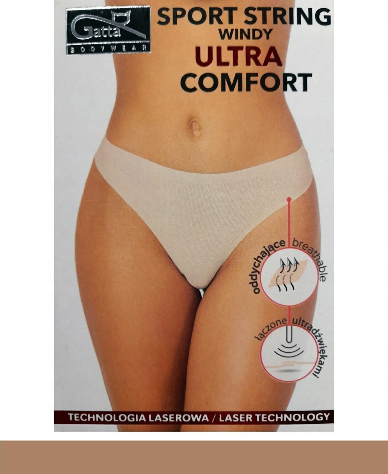 GATTA Sport String Windy Ultra Comfort Beige / M Stringi damskie wykonane z bardzo elastycznej i delikatnej mikrofibry, z bawełnianym klinem. Cięte laserowo, płasko wykończone, bezuciskowe, nie odznaczają się pod ubraniem. Boki łączone ultradźwiękami. Dają poczucie lekkości i komfortu. Skład: 85% …