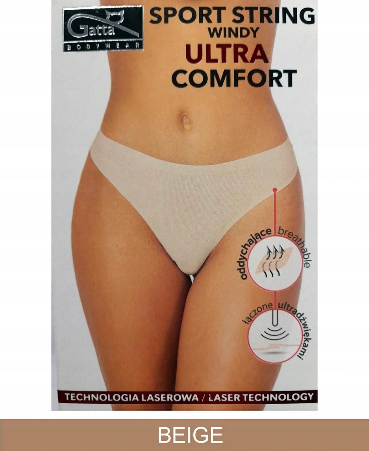 GATTA Majtki - Sport String Windy Ultra k.:Beige r.:L Stringi damskie wykonane z bardzo elastycznej i delikatnej mikrofibry, z bawełnianym klinem. Cięte laserowo, płasko wykończone, bezuciskowe, nie odznaczają się pod ubraniem. Boki łączone ultradźwiękami. Dają poczucie lekkości i komfortu. Skład: …