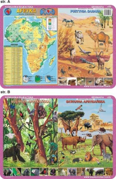 Mapa fizyczna Afryki z wyróżnieniem różnorodności zwierzęcej Podkładka edukacyjna "Afryka - zwierzęta Sahary" pozwala dzieciom i młodzieży zaznajomić się z bogactwem przyrodniczym tego fascynującego i zróżnicowanego kontynentu. Prezentuje ona trzy główne środowiska charakterystyczne dla Afryki, w …