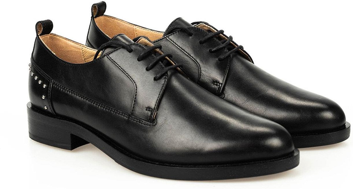 Wiązane sznurówką Zaokrąglony nosek Z logowaną podeszwą Tył ozdobiony dżetami Wykonane ze skóry naturalnej Zapakowane w firmowe pudełko