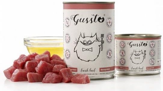 Gussto Fresh Beef Świeża Wołowina Pełnoporcjowa, bezzbożowa karma dla kotów w każdym wieku. Karma produkowana jest z najwyższej jakości składników, zawiera 70% pełnowartościowego mięsa oraz podrobów z wołowiny. Prosty skład zapewnia całkowite pokrycie potrzeb żywieniowych kotów jako gatunku. Karma nie zawiera zbóż, ani innych składników nietolerowanych przez koty. Wywar własny z mięsa zwiększa smakowitość i nadaje karmie charakterystycznej konsystencji za którą koty przepadają. Olej z ostropestu zwiększa tłustość, podpasuje więc nawet kotom wybrednym. Wysoka zawartość mięsa odpowiada za dobre trawienie i prawidłową kondycję organizmu. Wołowina jest mięsem smakowitym i bogatym w minerały oraz zdrowe tłuszcze. Karma posiada dopracowany stosunek wapń:fosfor. Jest to bardzo ważne w żywieniu kotów, odpowiednia zawartość tych minerałów minimalizuje ryzyko powstania schorzeń układu moczowego oraz kostnego. Karma zawiera odpowiednią zawartość tauryny - aminokwasu egzogennego, niezbędnego w żywieniu kotów. Odpowiada on za zdrowy wzrok i serce kota, wzmacnia kondycję całego organizmu i poprawia witalność. Jest konieczny dla utrzymania sierści kota w pięknym stanie. Jako karma monobiałkowa sprawdzi się przy kotach z nietolerancjami pokarmowymi, alergiamii, a także jako podstawa diety eliminacyjnej. Polega ona na podawaniu tylko jednego rodzaju białka pochodzenia zwierzęcego przez okres ok. 4 miesięcy w celu sprawdzenia jak organizm kota na nie reaguje.   Najważniejsze cechy: Bezzbożowa - nie zaburza trawienia Wysoki udział mięsa, dodatek podrobów - odpowiednie proporcje w żywieniu kotów Odpowiedni stosunek wapń:fosfor 2000 mg tauryny dla mocnego wzroku, serca, pięknej sierści i silnej odporności Konsystencja mielonki - w puszcze lub wilgotnego pasztetu - w saszetce Monobiałkowa Skład: 70% wołowina (w tym ok. 2/3 mięso mięśni i serca, ok 1/3 wątroba, i płuca), 28,8% wywar własny z mięsa, 1% minerały, 0,2% olej z ostropestu   Analiza: Białko: 10,7%, tłuszcz: 6,7%, popiół surowy: 2,4%, włókno surowe: 0,5%, wilgotność: 79% Zrównoważony stosunek wapno/fosfor: 1,2/1 Dodatki na 1 kg: Witamina D3: 220 IE, witamina E: 33 IE, cynk jako siarczan cynku, monohydrat: 16,5 mg, mangan jako siarczan manganu (II), monohydrat: 3,3 mg, jod jako jodan wapnia: 0,825 mg, tauryna: 2000 mg, biotyna: 330 µg Po otwarciu przechowywać w lodówce i zużyć w ciągu 2 dni. Zaleca się podawanie w temperaturze pokojowej, można rozrozbić z odrobiną wody. Niezjedzony pokarm po wyschnięciu wyrzucić. Miski regularnie myć. Wprowadzają karmę po raz pierwszy do menu kota zaleca się przeprowadzić okres przejściowy, podczas którego miesza się poprzednią karmę z nową. Najlepiej wprowadzać ją od 3 do 6 dni. Zapewnić kotu dostęp do świeżej wody pitnej.